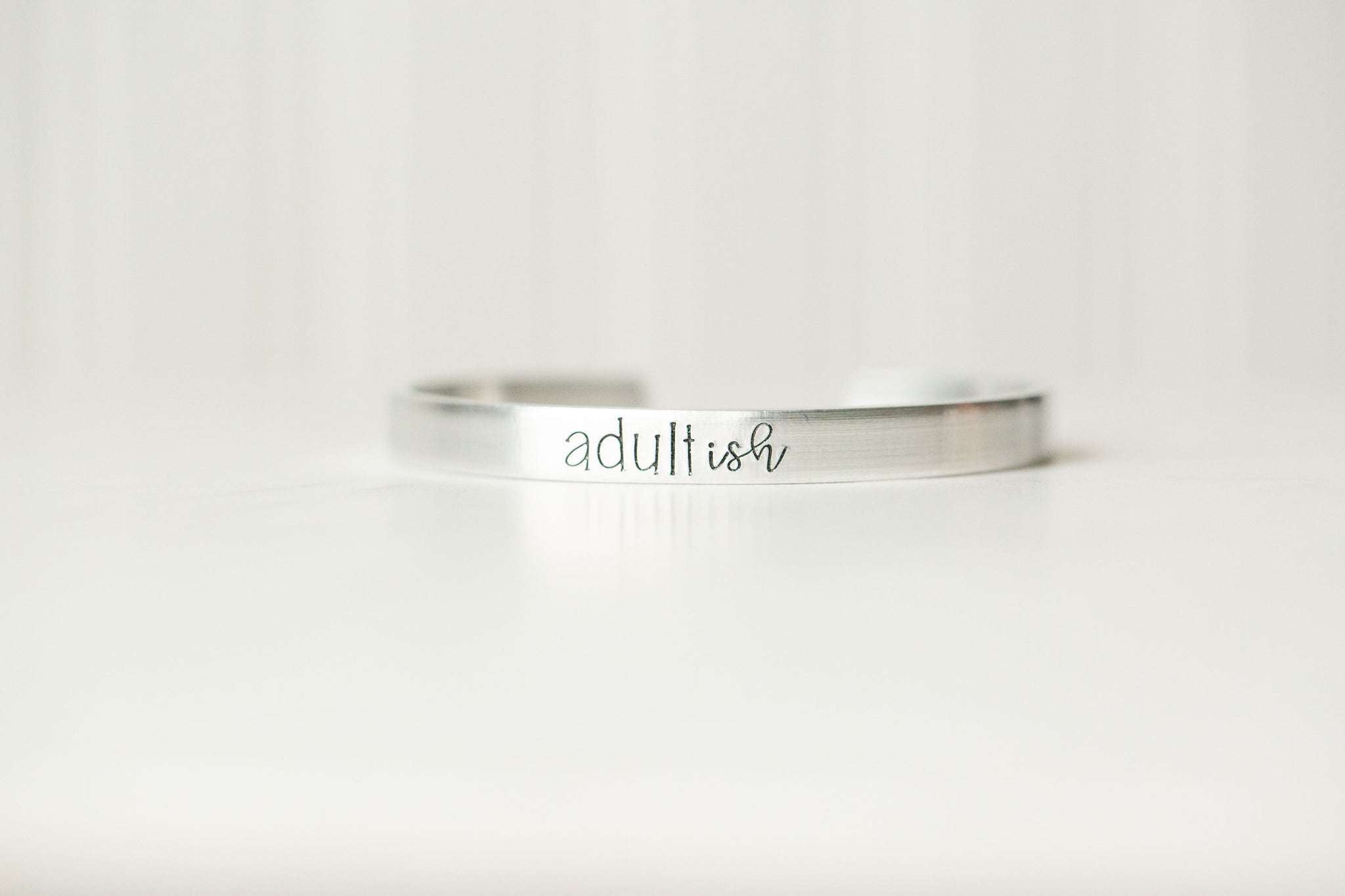 Made from 1/8" wide aluminum, cuff bracelet is lightweight, non-tarnish, and hypoallergenic (nickel-free!) Cuff is adjustable to fit most. Total length of the band measures 6". A 7" bracelet is available upon request.