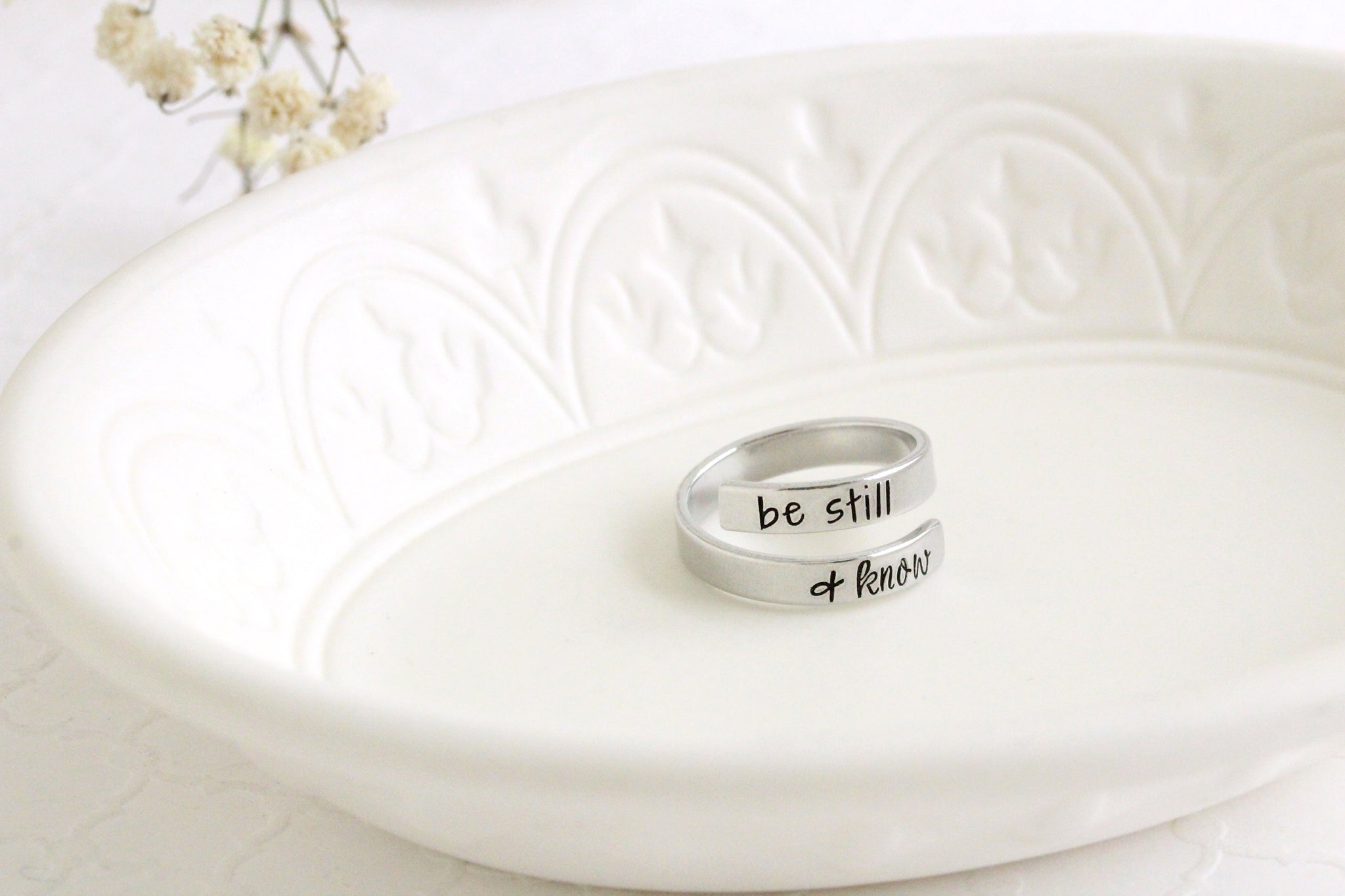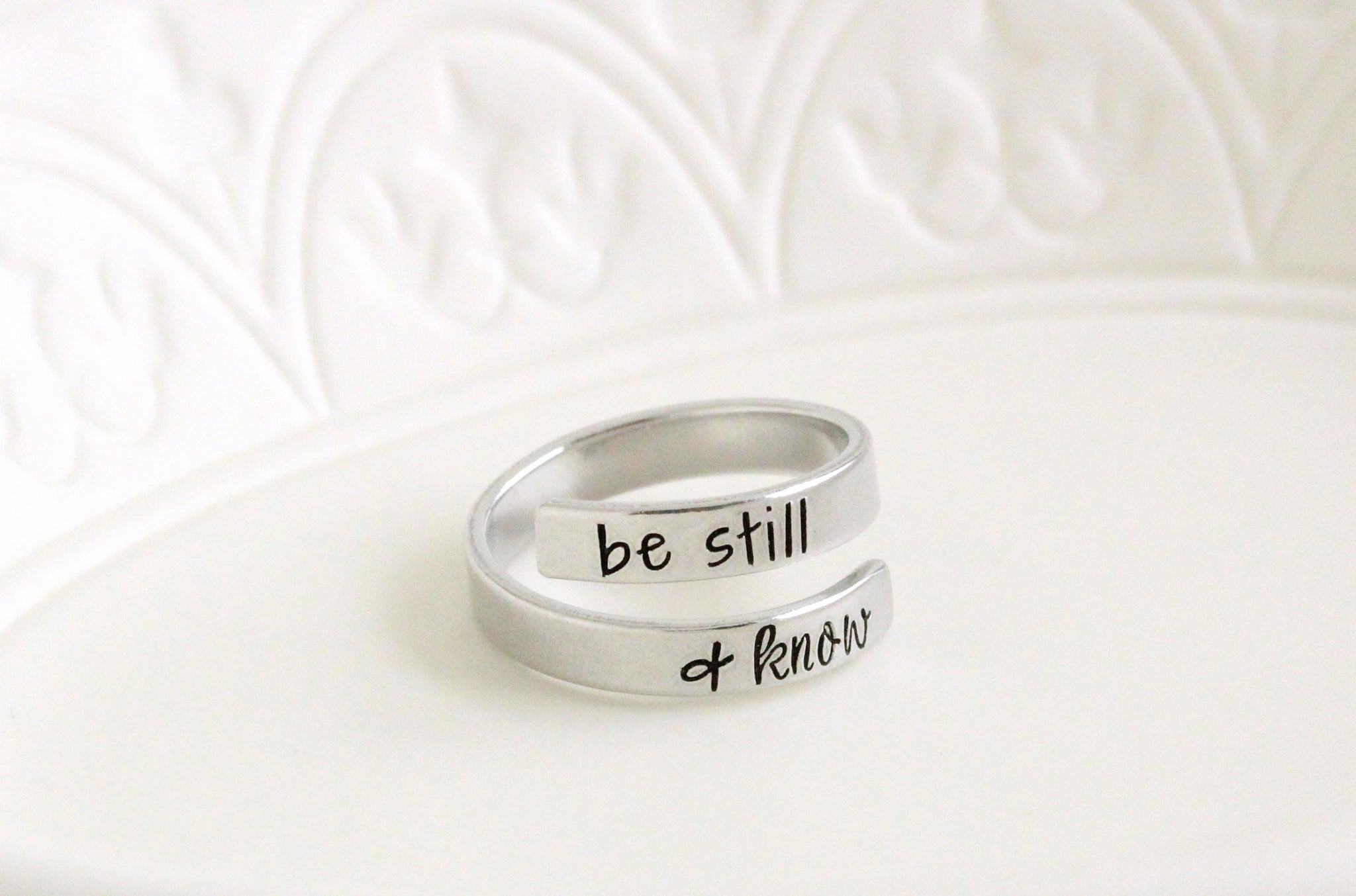Be still and know. An easy-to-wear adjustable ring with a loving message.
