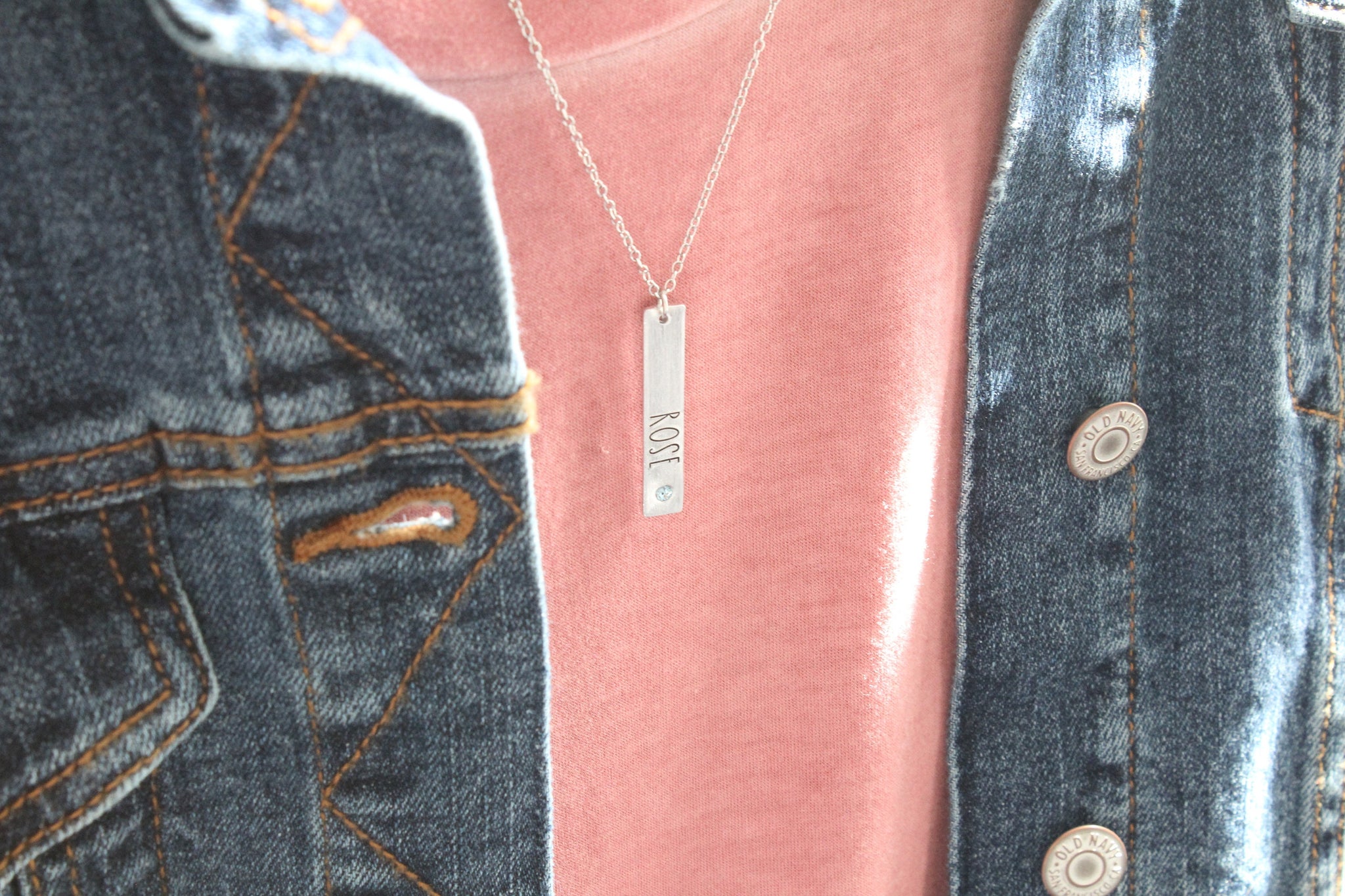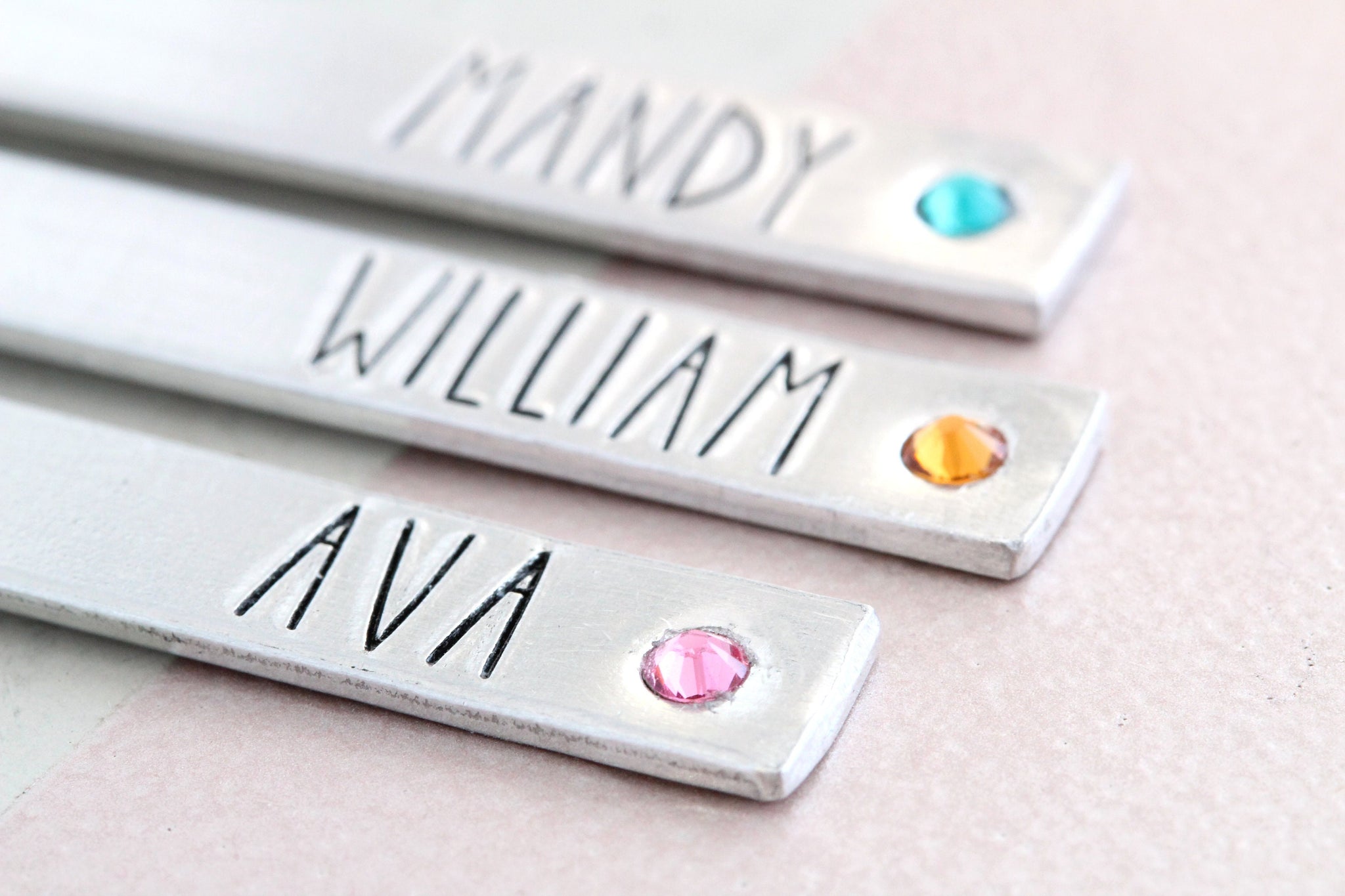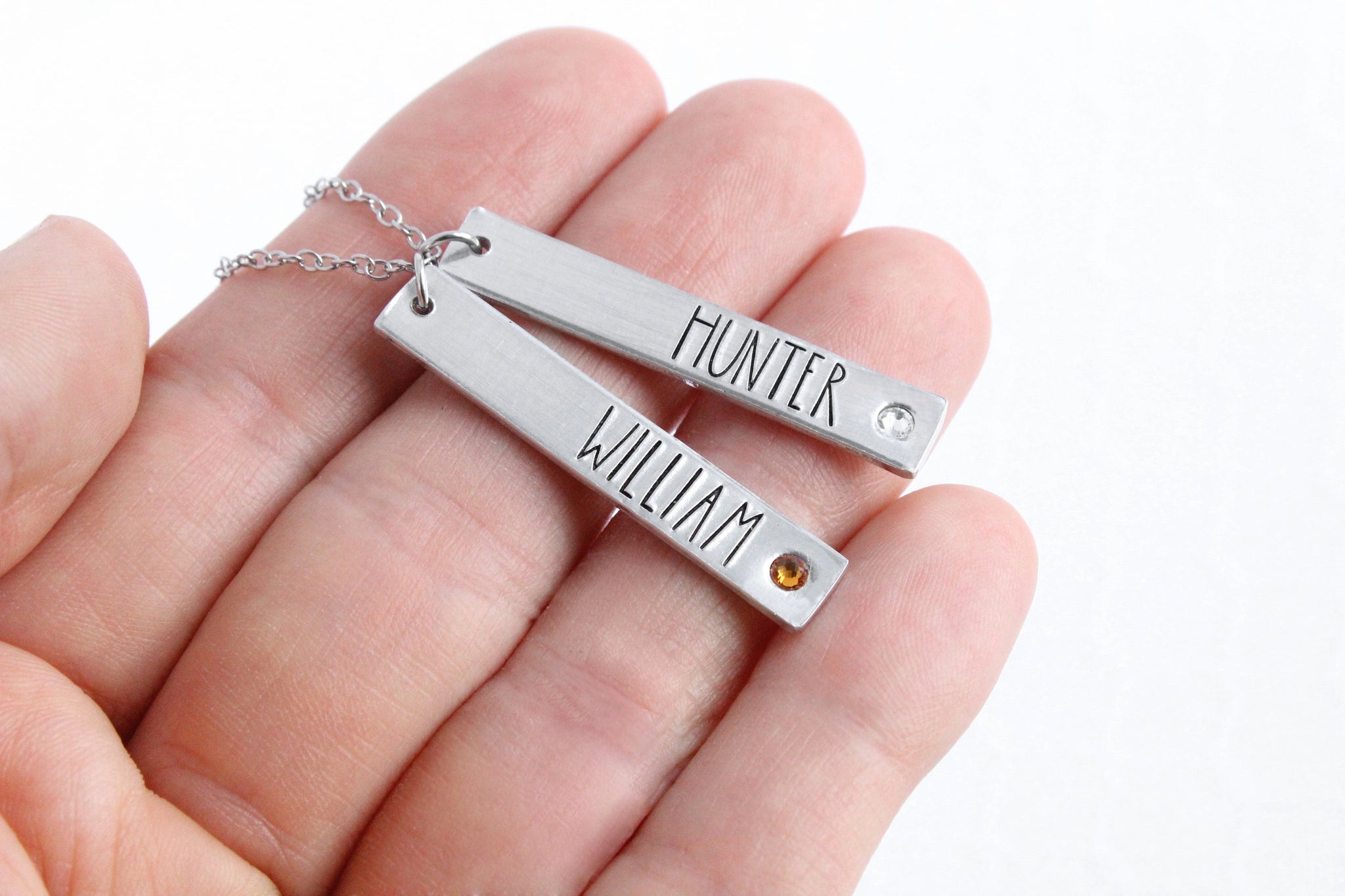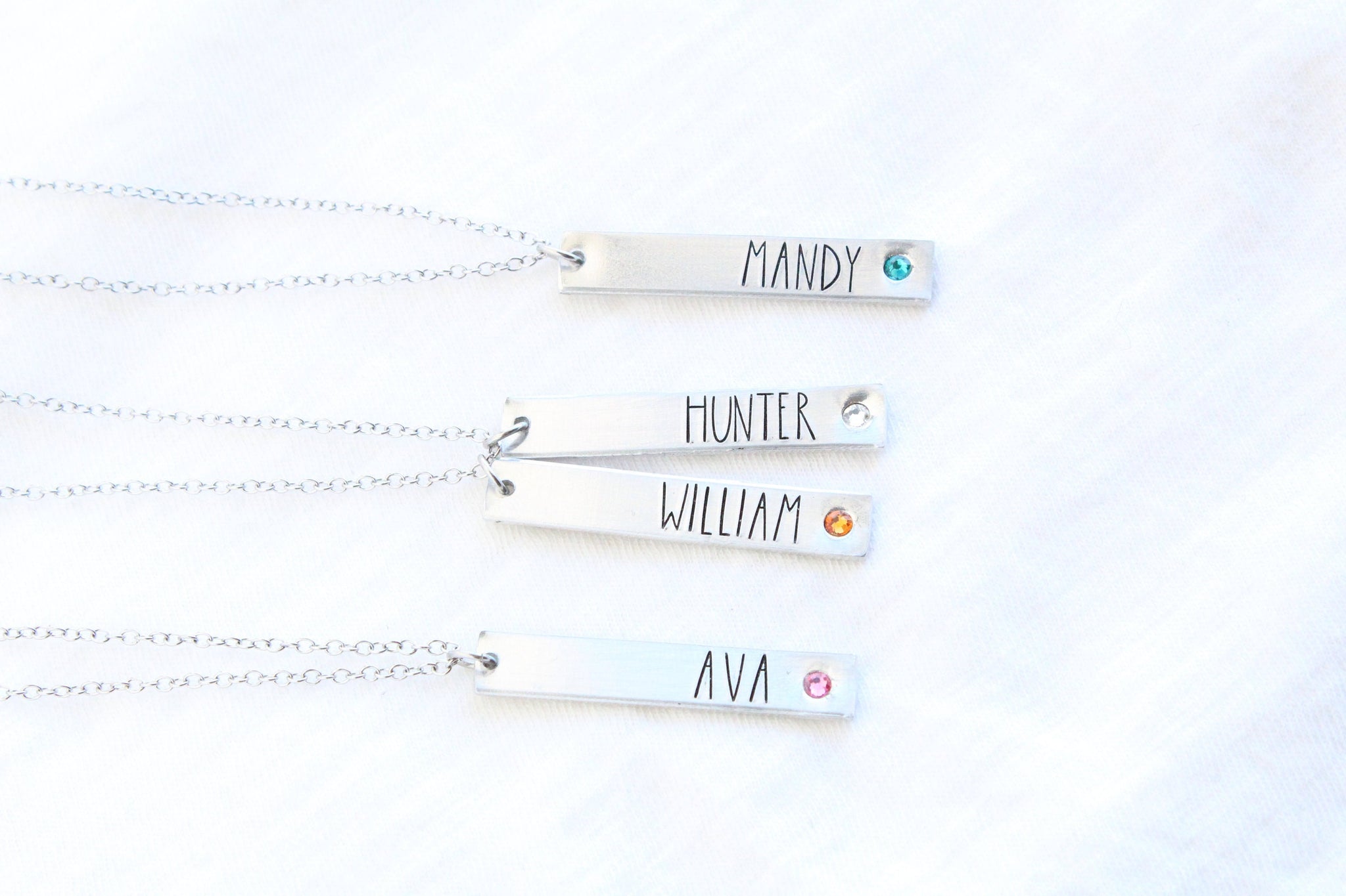 teal Details -- Pendants are 1 1/2" x 1/4", made of aluminum, and hang from a stainless steel cable chain. All metals are non-tarnish and hypoallergenic. Fastens with a lobster clasp. Birthstone is a colored crystal set into the charm. Personalize -- Add names and crystal colors in personalization box. Handcrafted -- These are not machine engraved; instead, each letter is lined up one-by-one and hammered into the metal by hand. For this reason, there may be slight differences in the spacing, depth, and alignment. These are characteristics that add to the charm of being handmade; do not expect machine perfection. Please be aware of turn-around and shipping times. Rush options available at checkout.