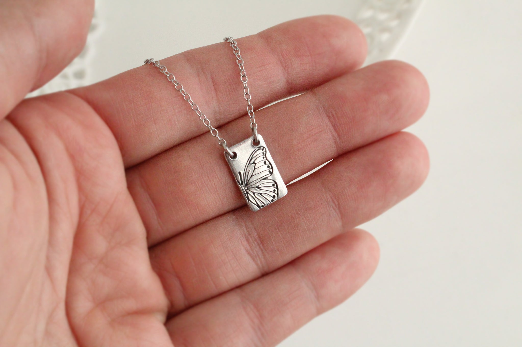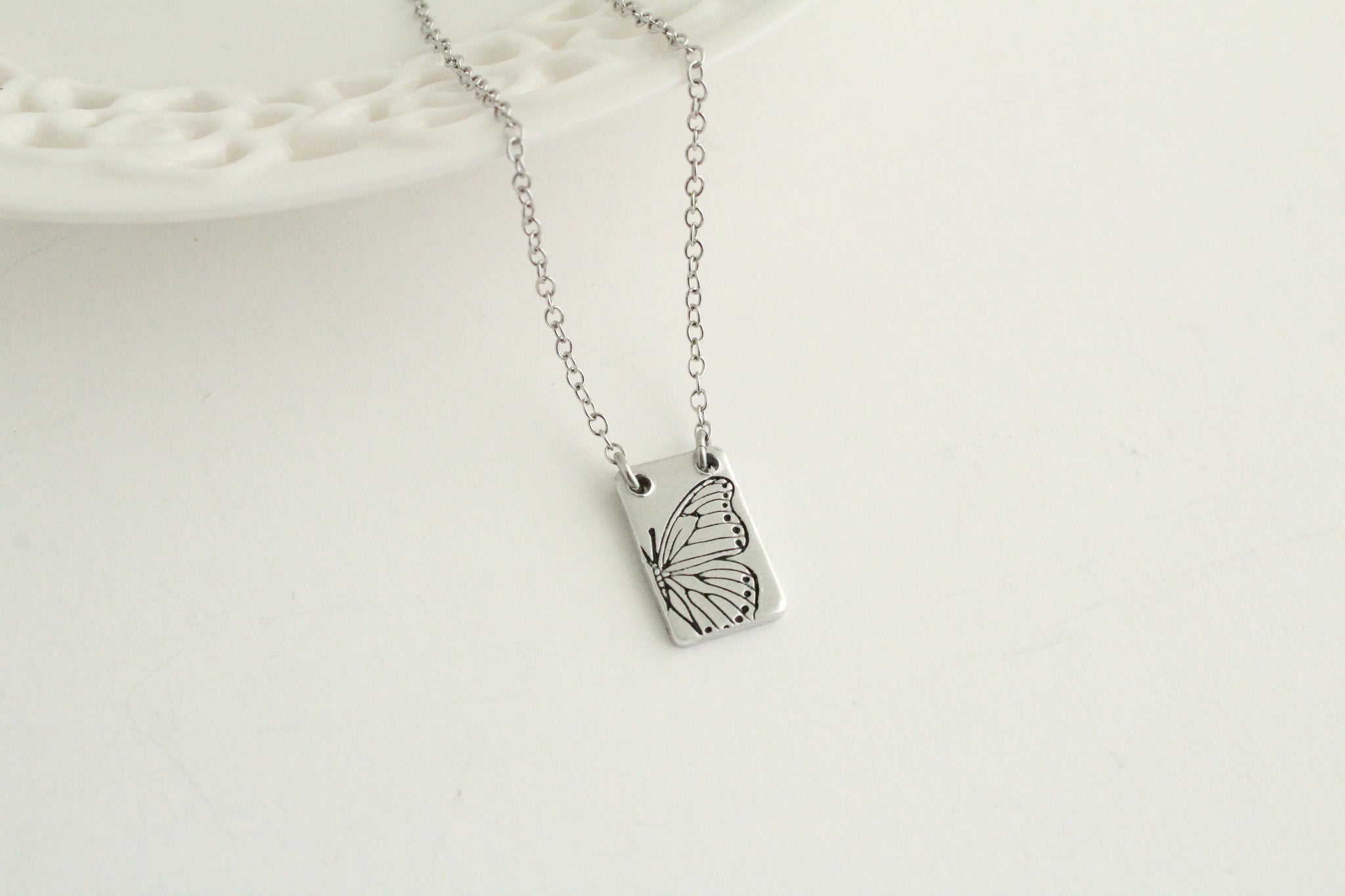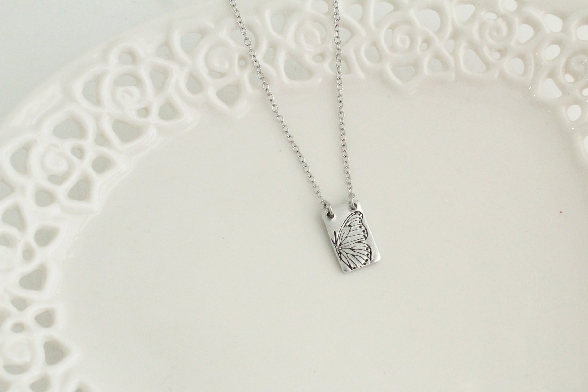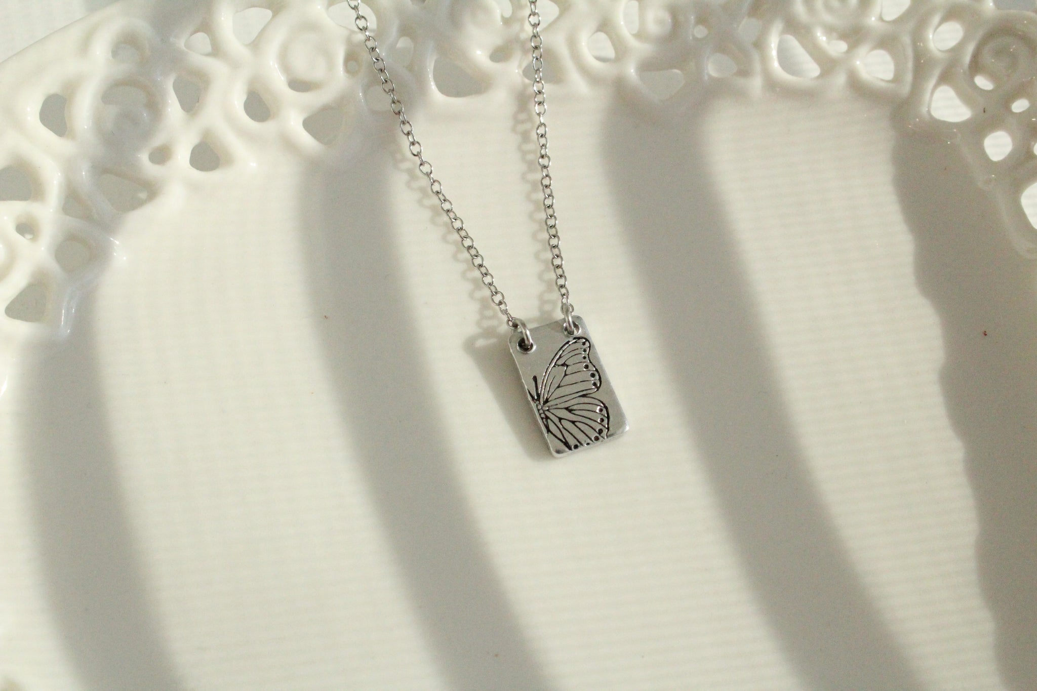 A dainty tag necklace featuring a glimpse of a fleeting butterfly.