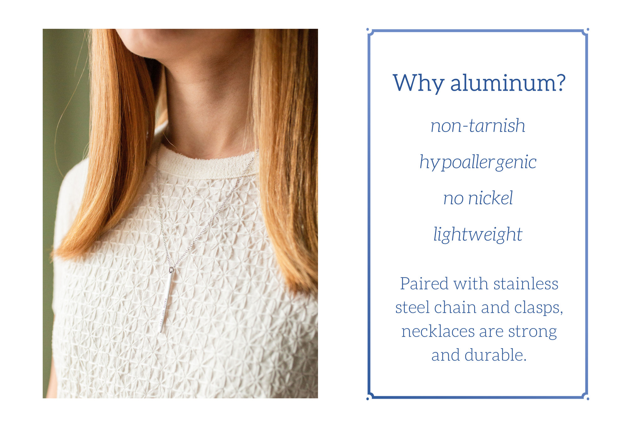 The pendant measures 3/8" by 5/8" and is made of aluminum which is lightweight and non-tarnish. The pendant hangs from a durable, stainless steel cable chain that fastens with a lobster clasp.