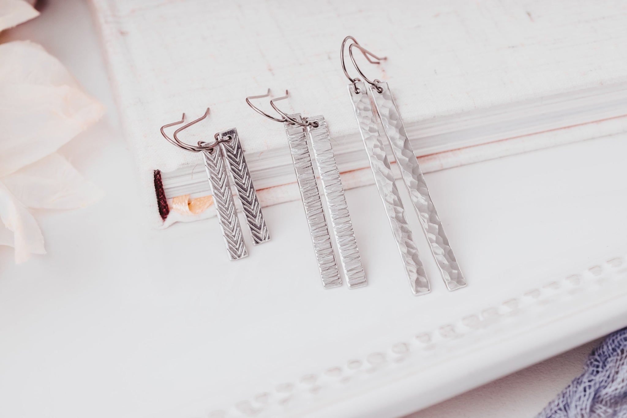 Earring pendants measure 1/8" wide and are made of aluminum which is nickel-free, non-tarnish, and very lightweight. The ear wires are made of titanium which is also nickel-free (and more hypoallergenic than even sterling silver).