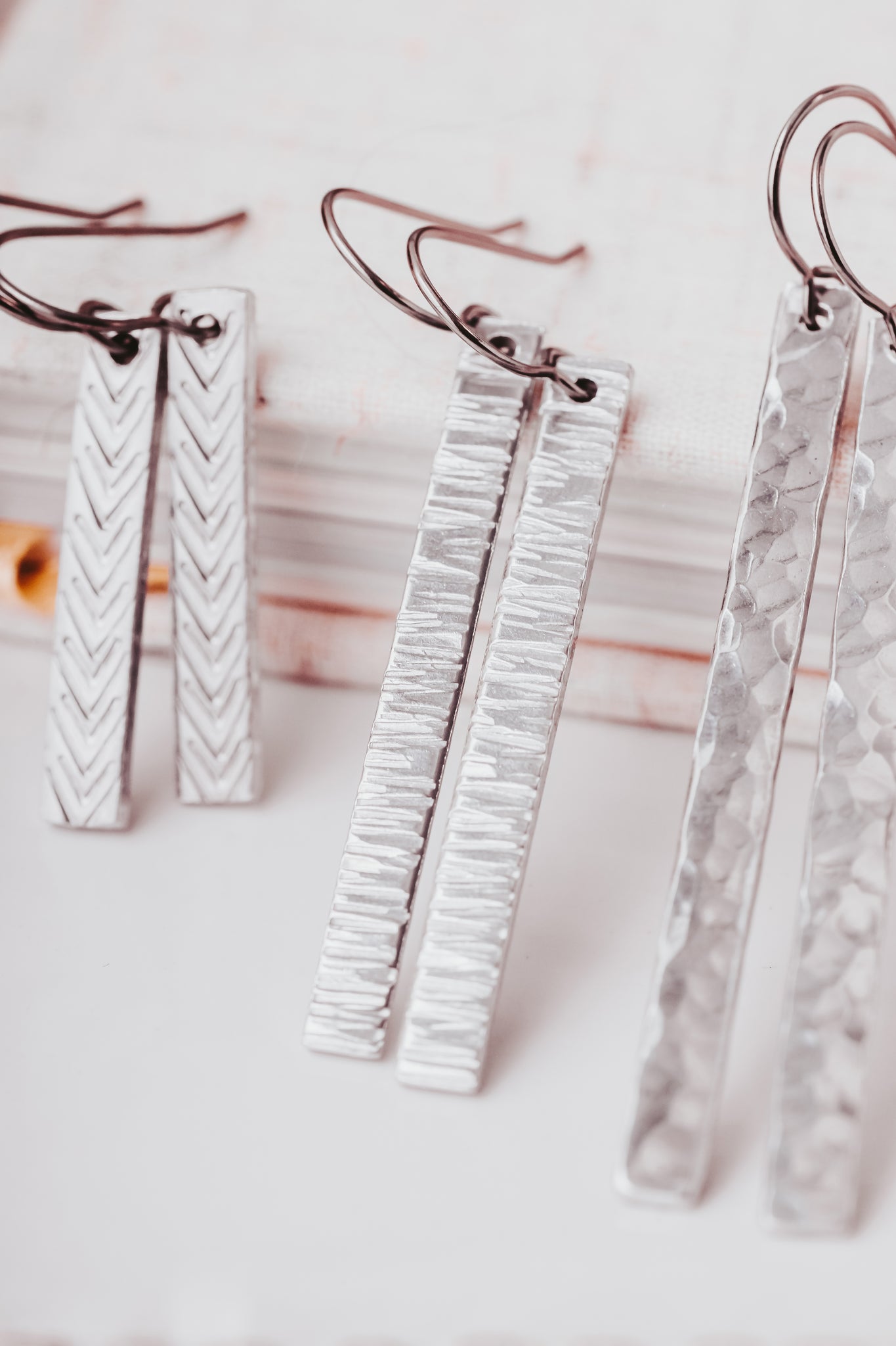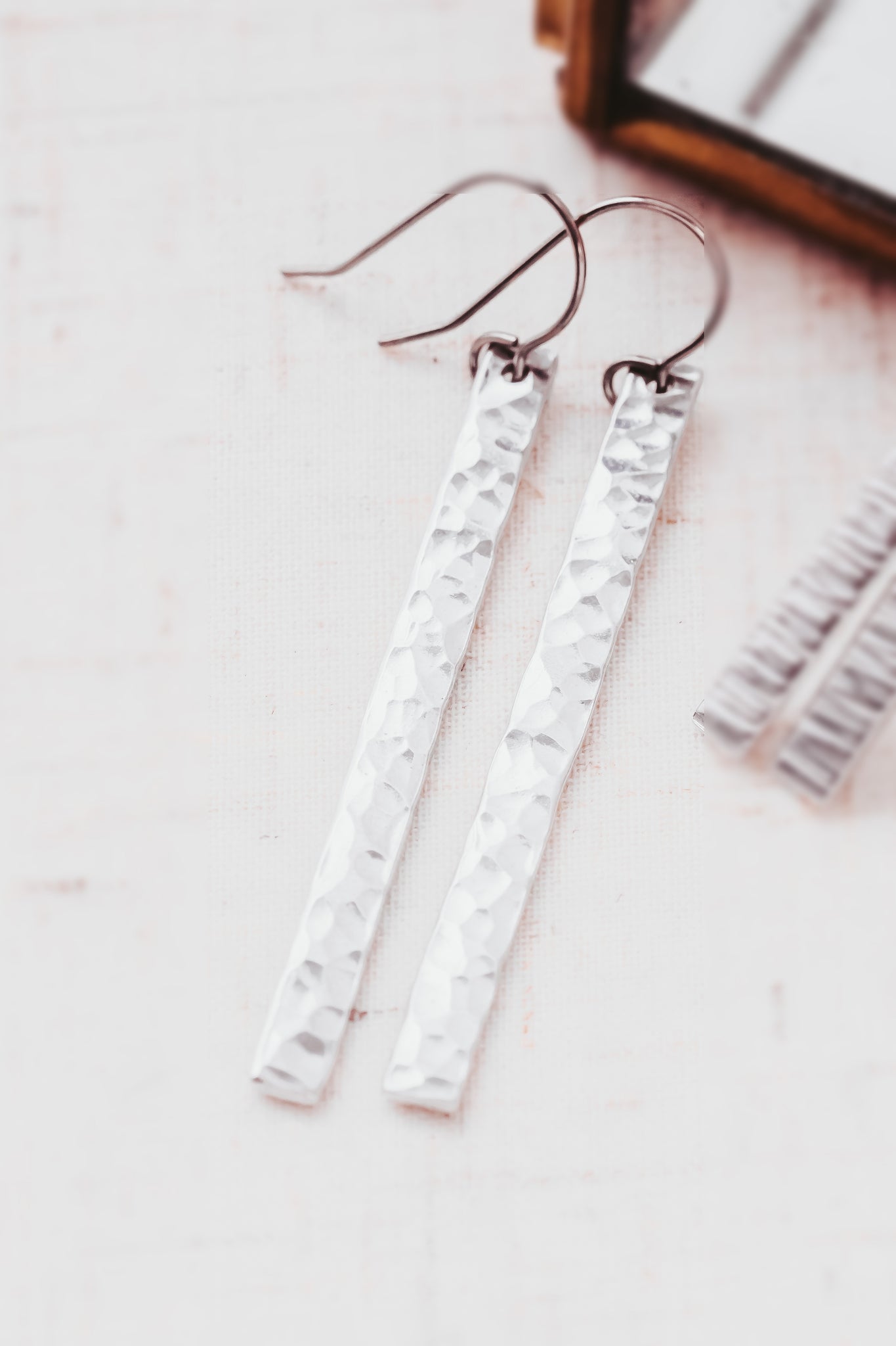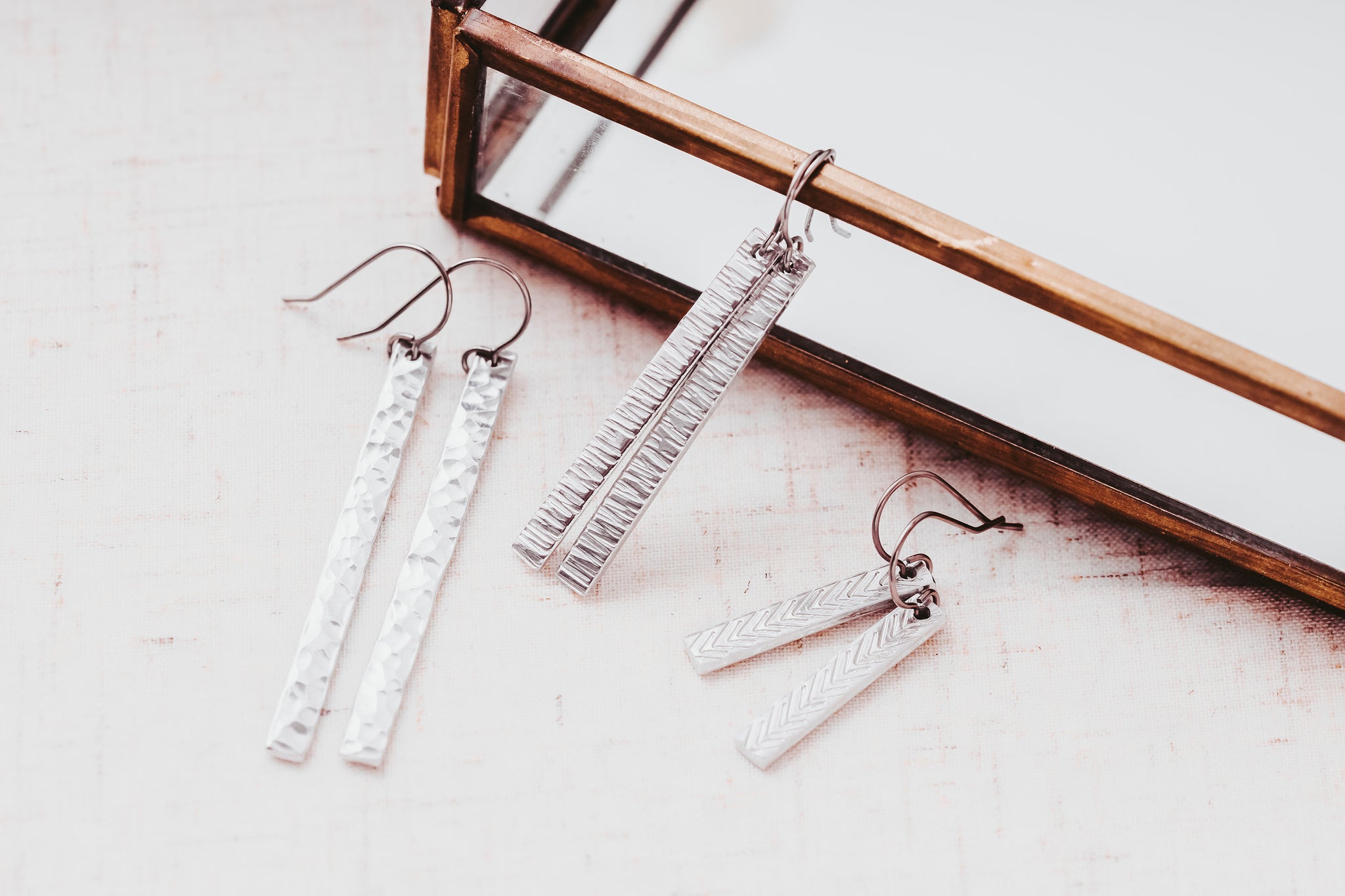 Earring pendants measure 1/8" wide and are made of aluminum which is nickel-free, non-tarnish, and very lightweight. The ear wires are made of titanium which is also nickel-free (and more hypoallergenic than even sterling silver).