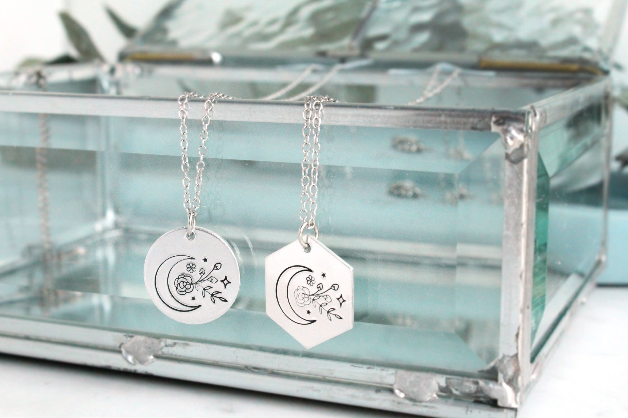 Both the hexagon and circle pendants measure 3/8" and are made of aluminum which is lightweight, non-tarnish, and hypoallergenic. Chain and clasp are made of stainless steel.