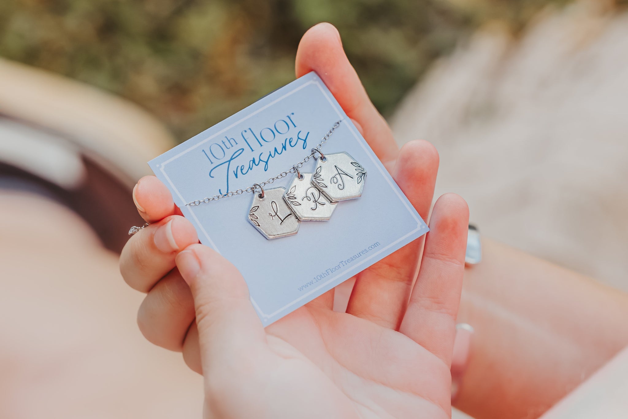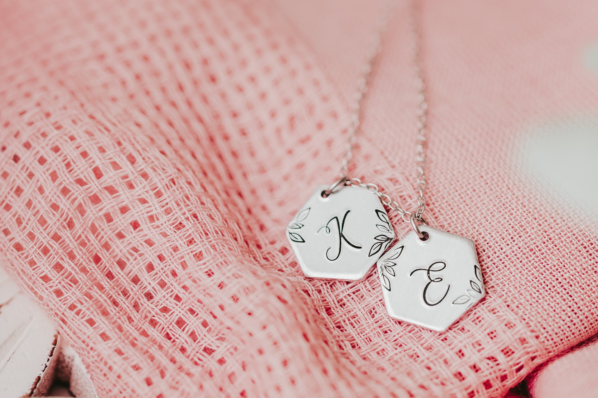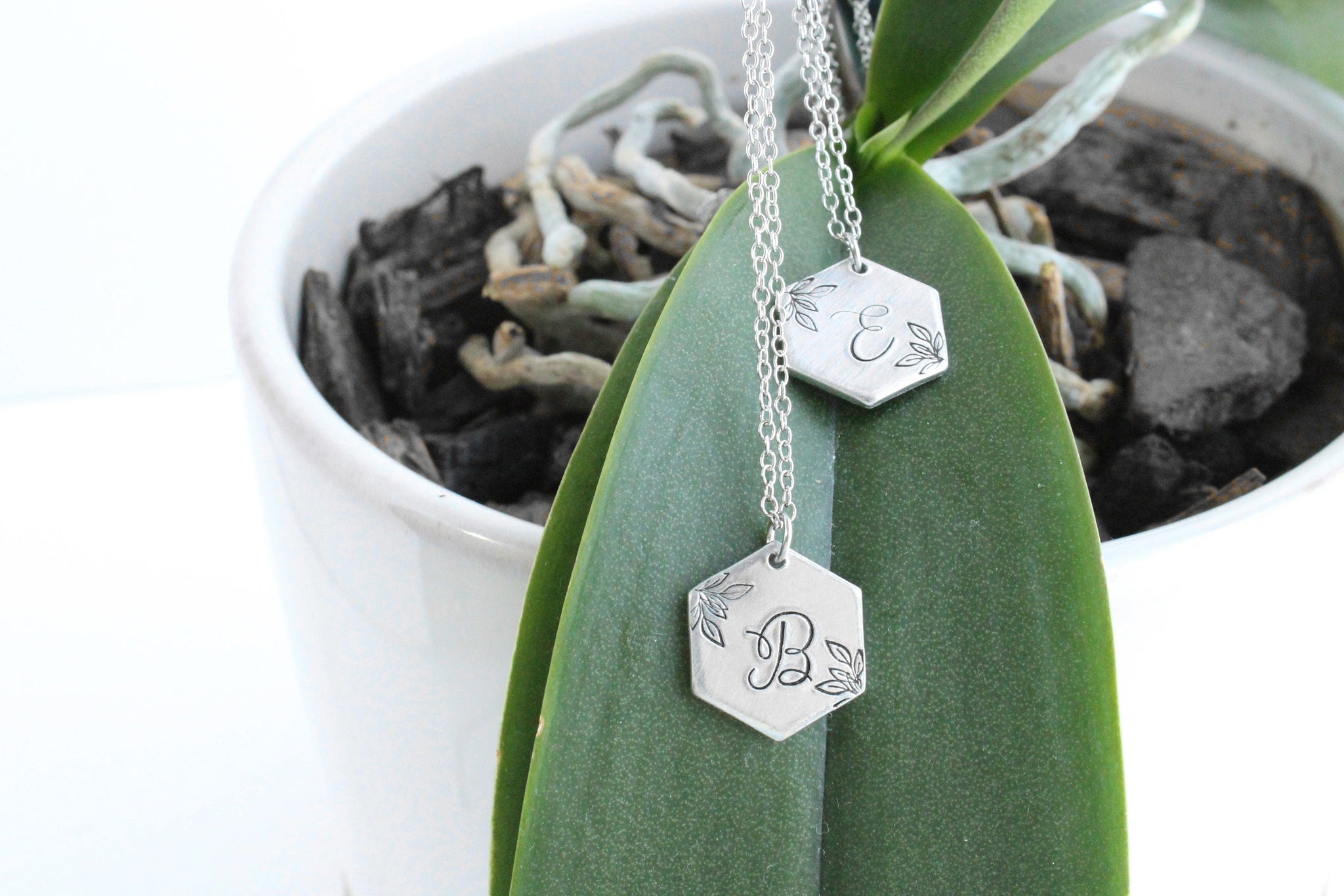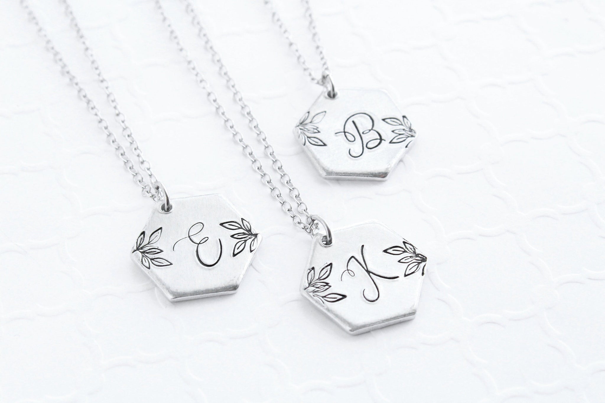 The hexagon pendant measures approximately 3/4" tall and is made of aluminum which is non-tarnish, lightweight and hypoallergenic. The chain and clasp is made of stainless steel which is strong and durable.
