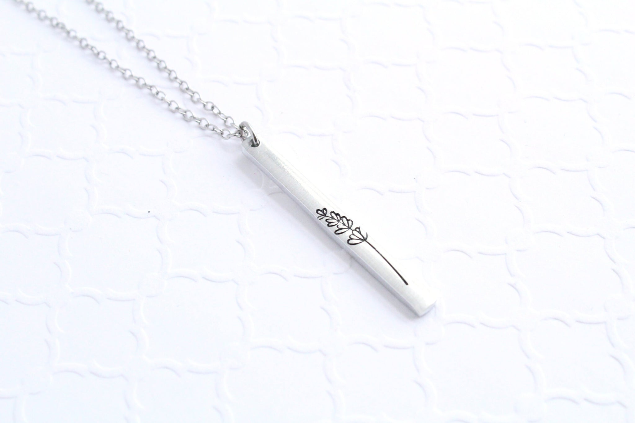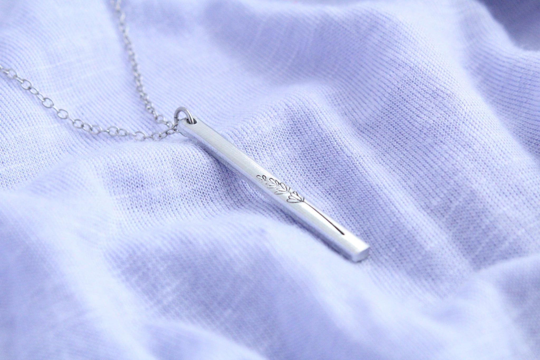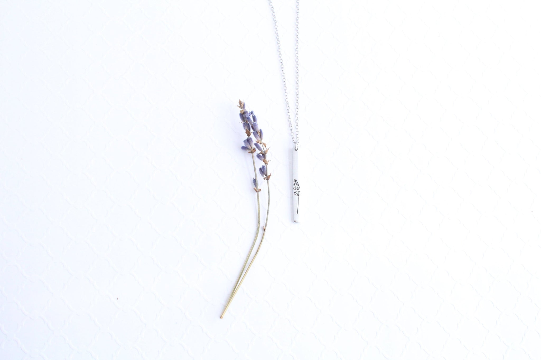 The necklace features a sprig of lavender on an aluminum pendant that measures 1 1/2" tall and 1/8" wide. Aluminum is lightweight, non-tarnish, and hypoallergenic. The pendant hangs from a stainless steel cable chain and fastens with a lobster clasp.