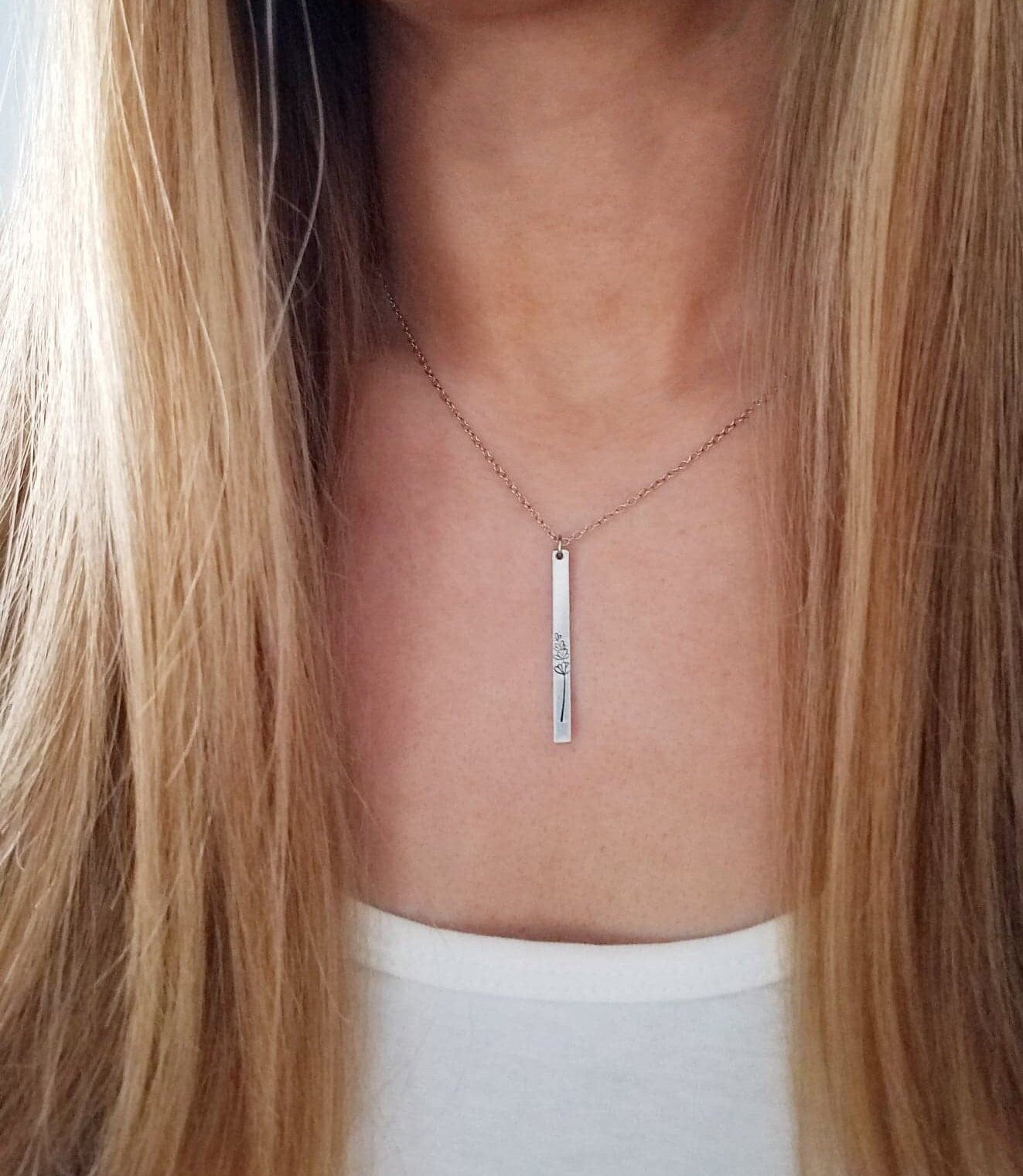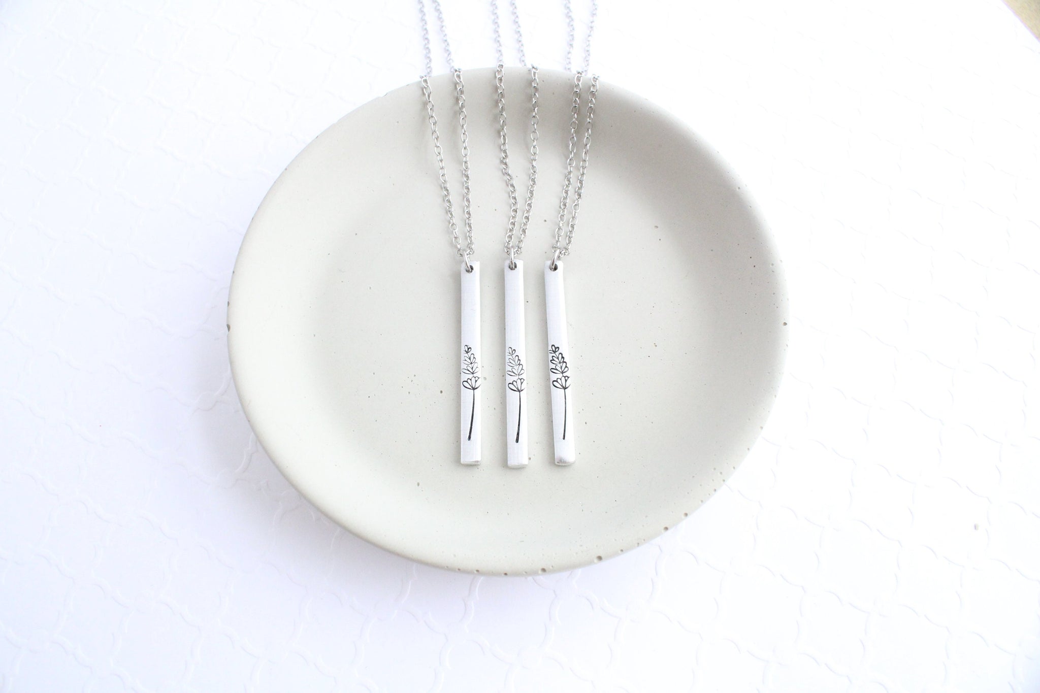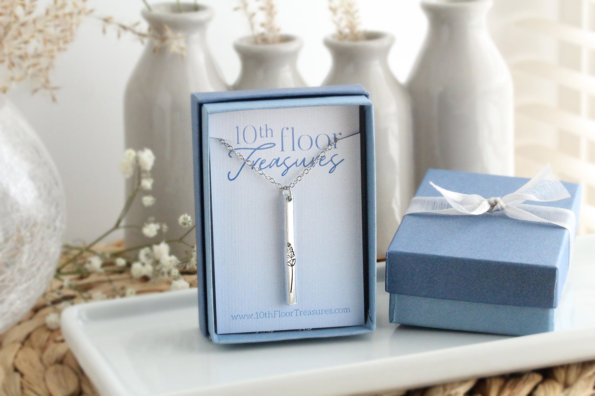 The necklace features a sprig of lavender on an aluminum pendant that measures 1 1/2" tall and 1/8" wide. Aluminum is lightweight, non-tarnish, and hypoallergenic. The pendant hangs from a stainless steel cable chain and fastens with a lobster clasp.