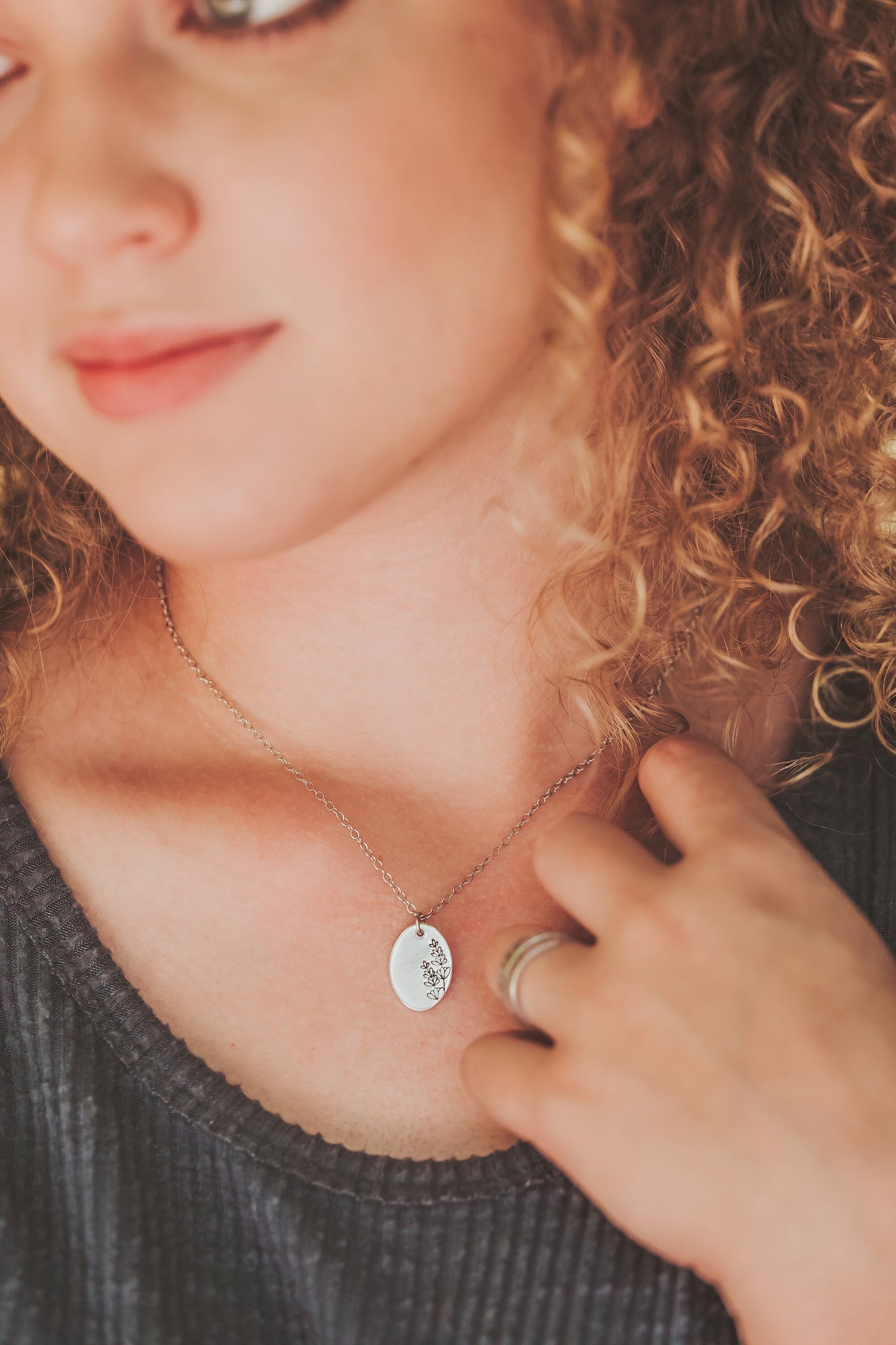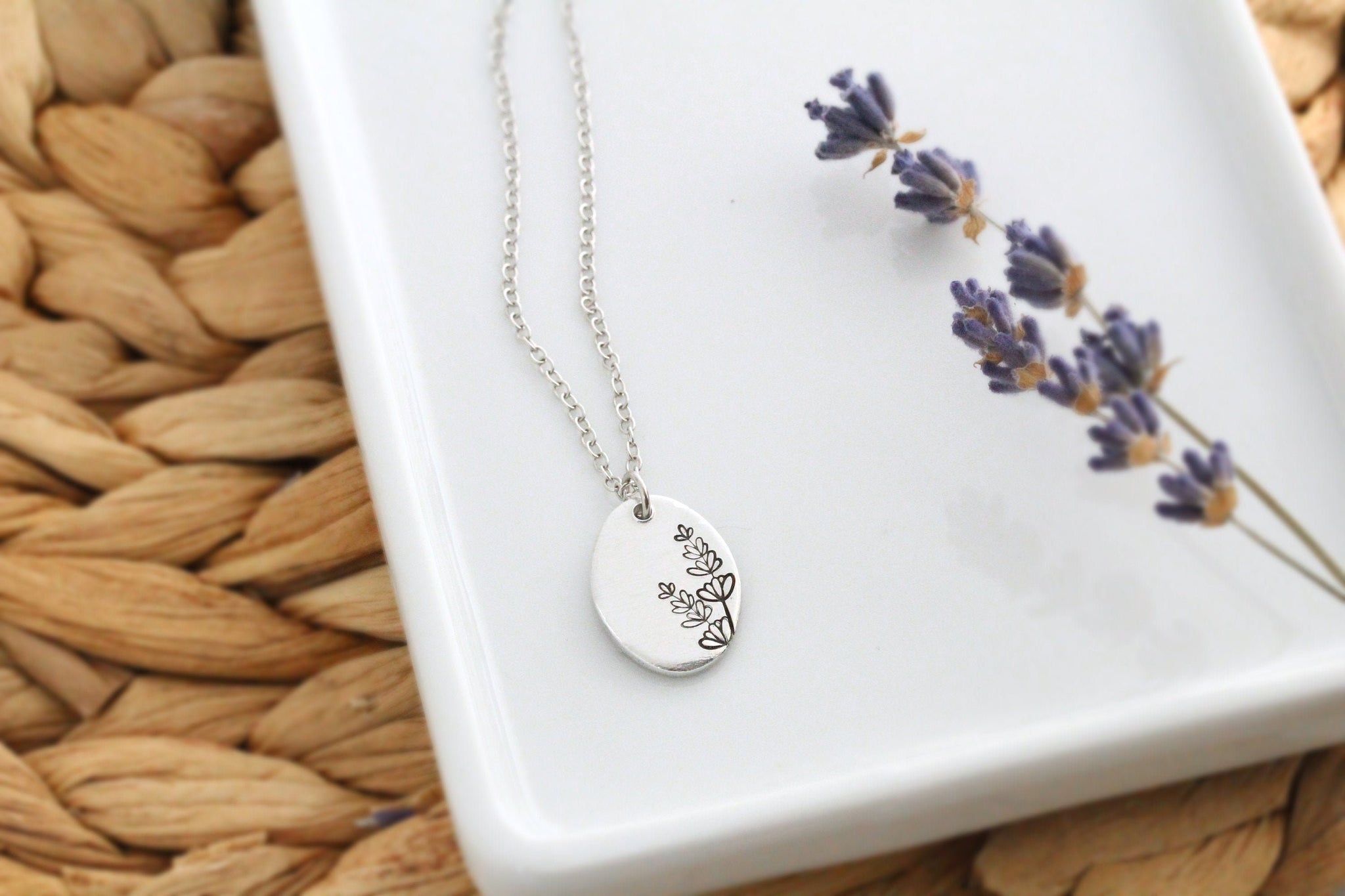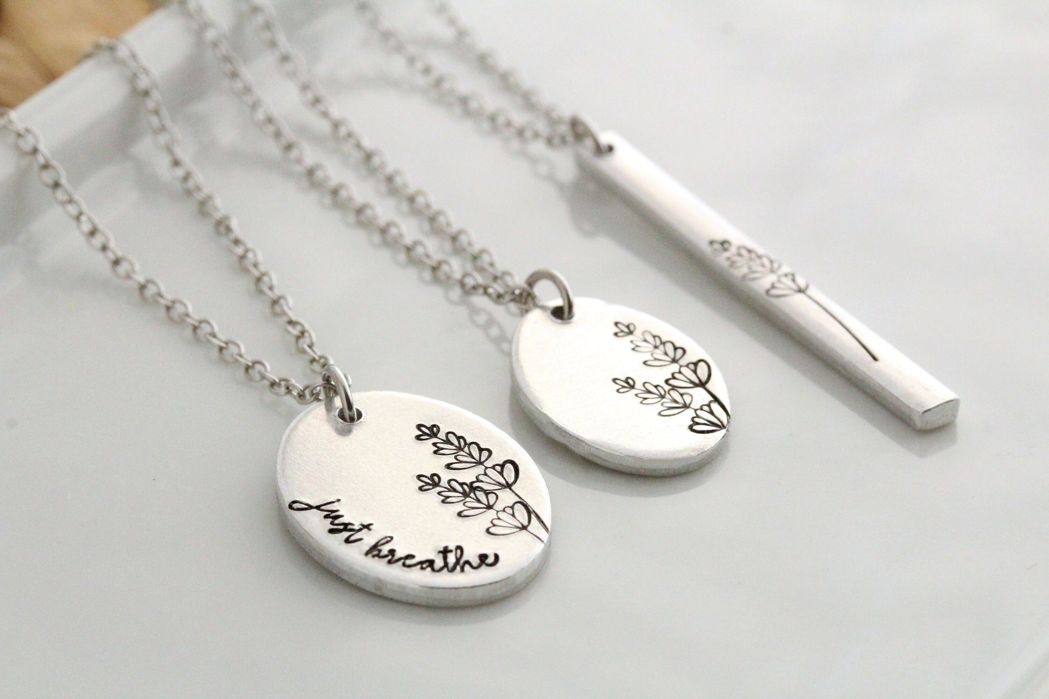 Lavender oval pendant measures 3/4" x 1/2", the "just breathe" pendant measures 7/8" x 5/8", and the vertical bar pendant measures 1 1/2" x 1/8". The pendants are all made of aluminum which is non-tarnish and lightweight. Chain and clasp are stainless steel.