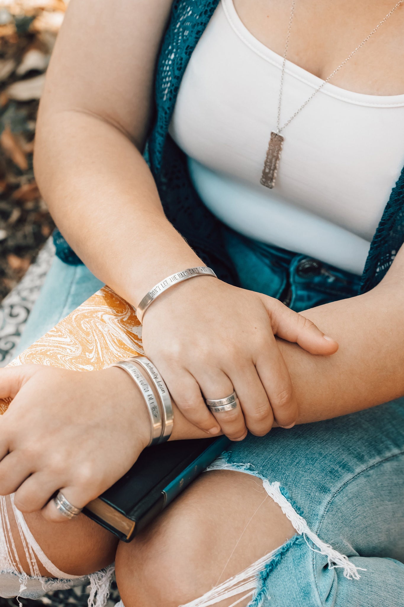 Made from 1/4" wide aluminum, cuff bracelet is lightweight, non-tarnish, and hypoallergenic - completely nickel free. Cuff measures 6" end-to-end and is adjustable to fit most. 7" cuff available upon request.
