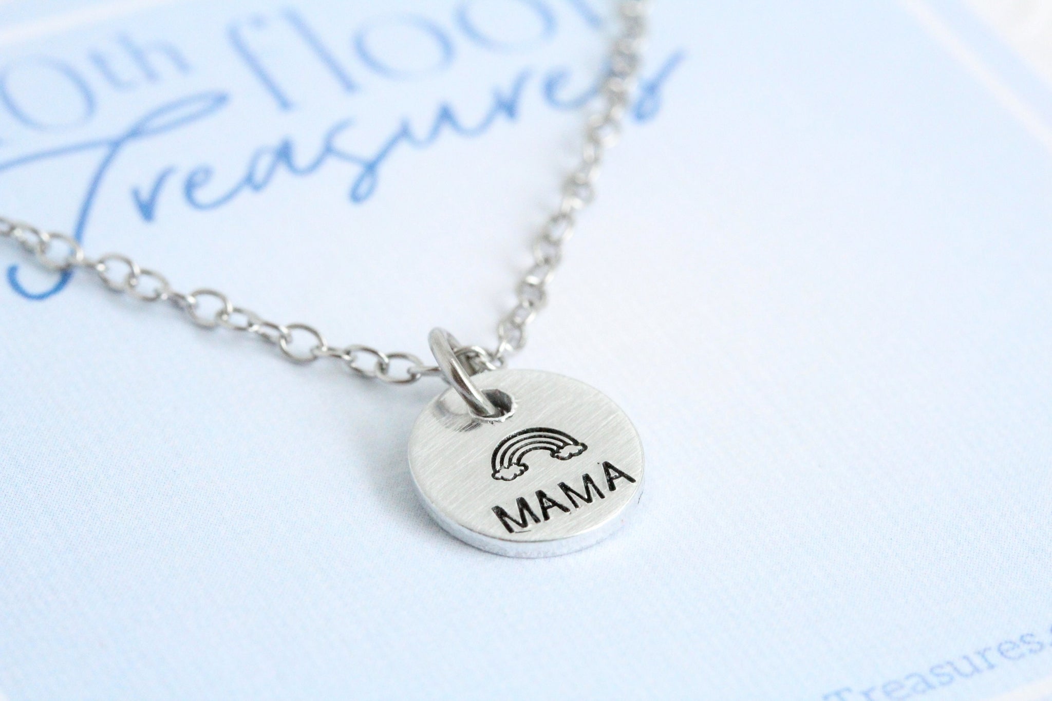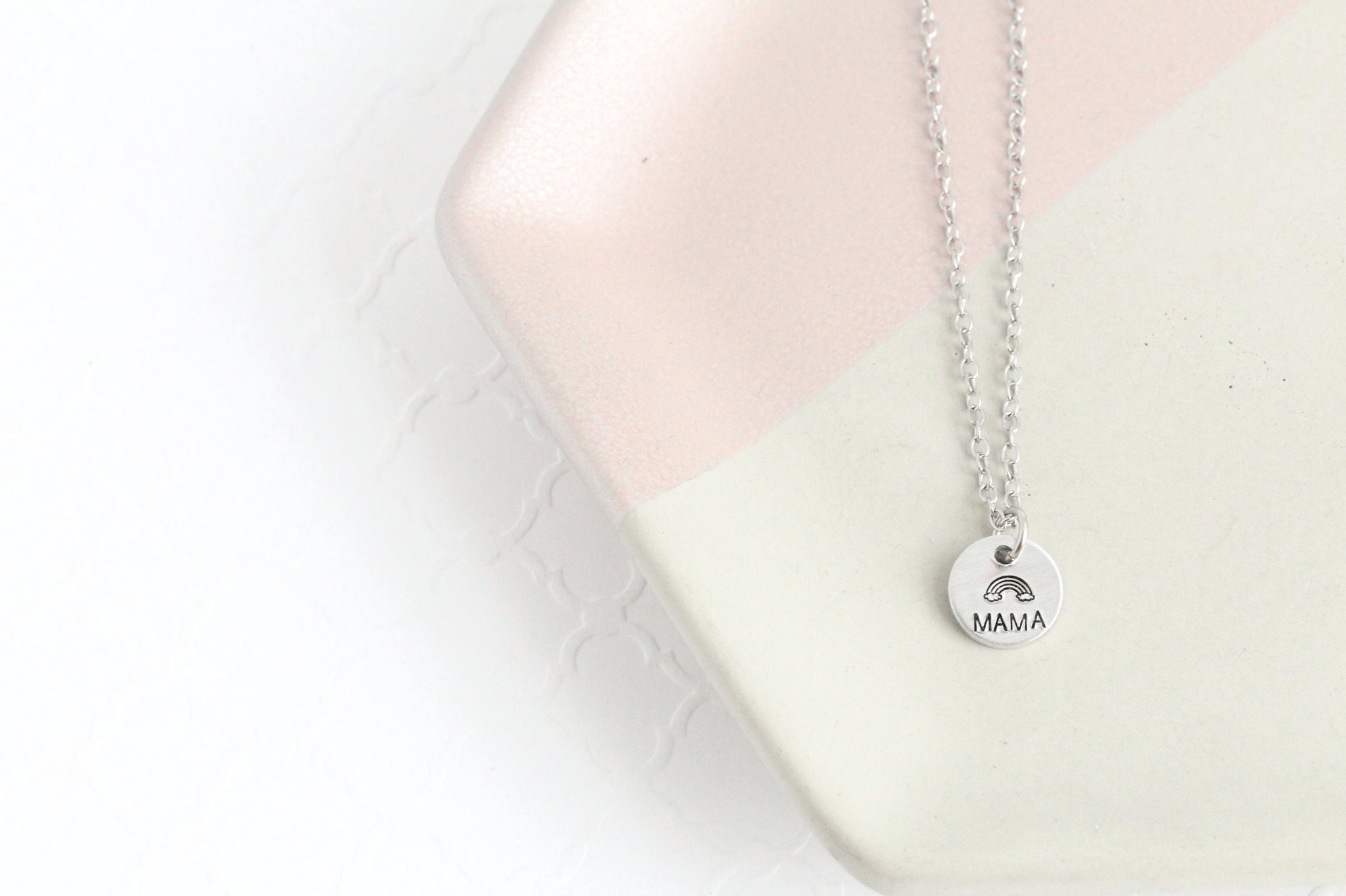 The necklace features a rainbow and the word "MAMA" on an aluminum pendant that measures 3/8". Aluminum is lightweight, non-tarnish, and hypoallergenic. The pendant hangs from a stainless steel cable chain and fastens with a lobster clasp.