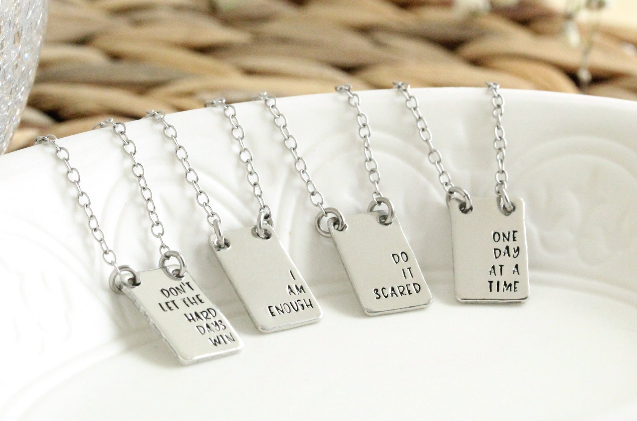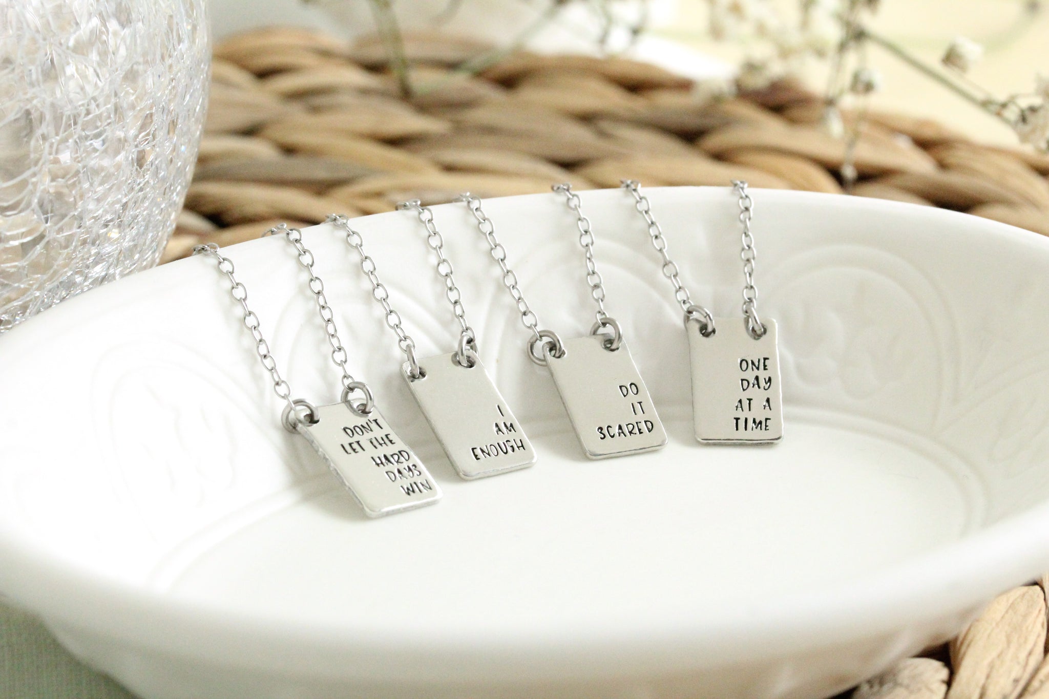 These are not machine engraved; instead, each letter is lined up one-by-one and hammered into the metal - all by hand. For this reason, there may be slight differences in the spacing, depth, and alignment. These are characteristics that add to the charm of being handmade; do not expect machine perfection. Please be aware of turn-around and shipping times. Rush options available at checkout.