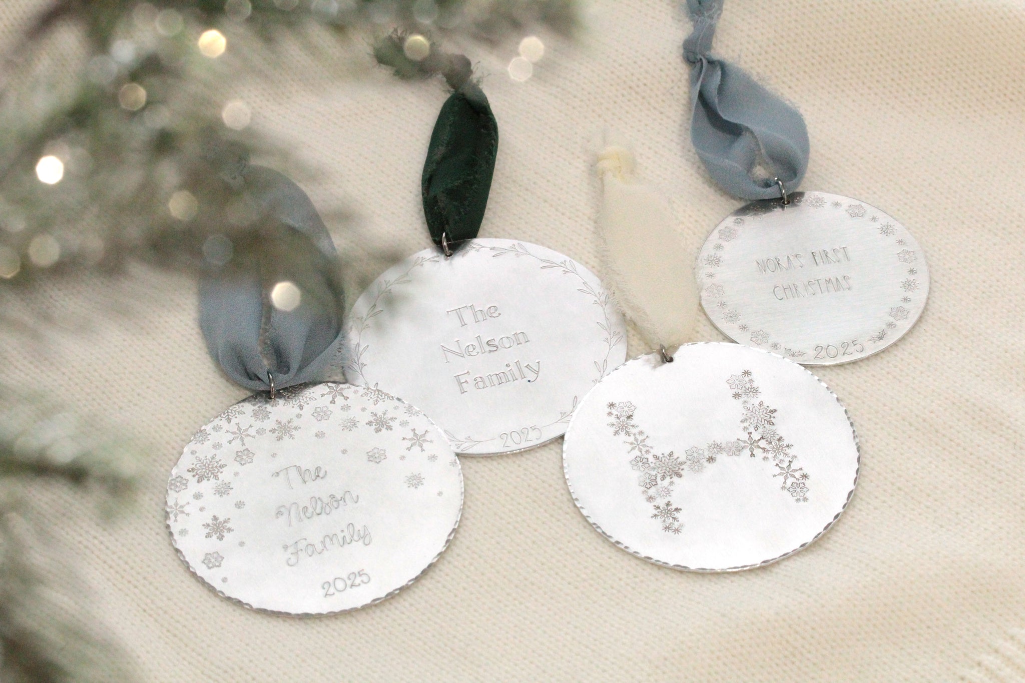 The ornament includes your choice of ribbon color and "A _____ Christmas 2025" stamped in the middle.
