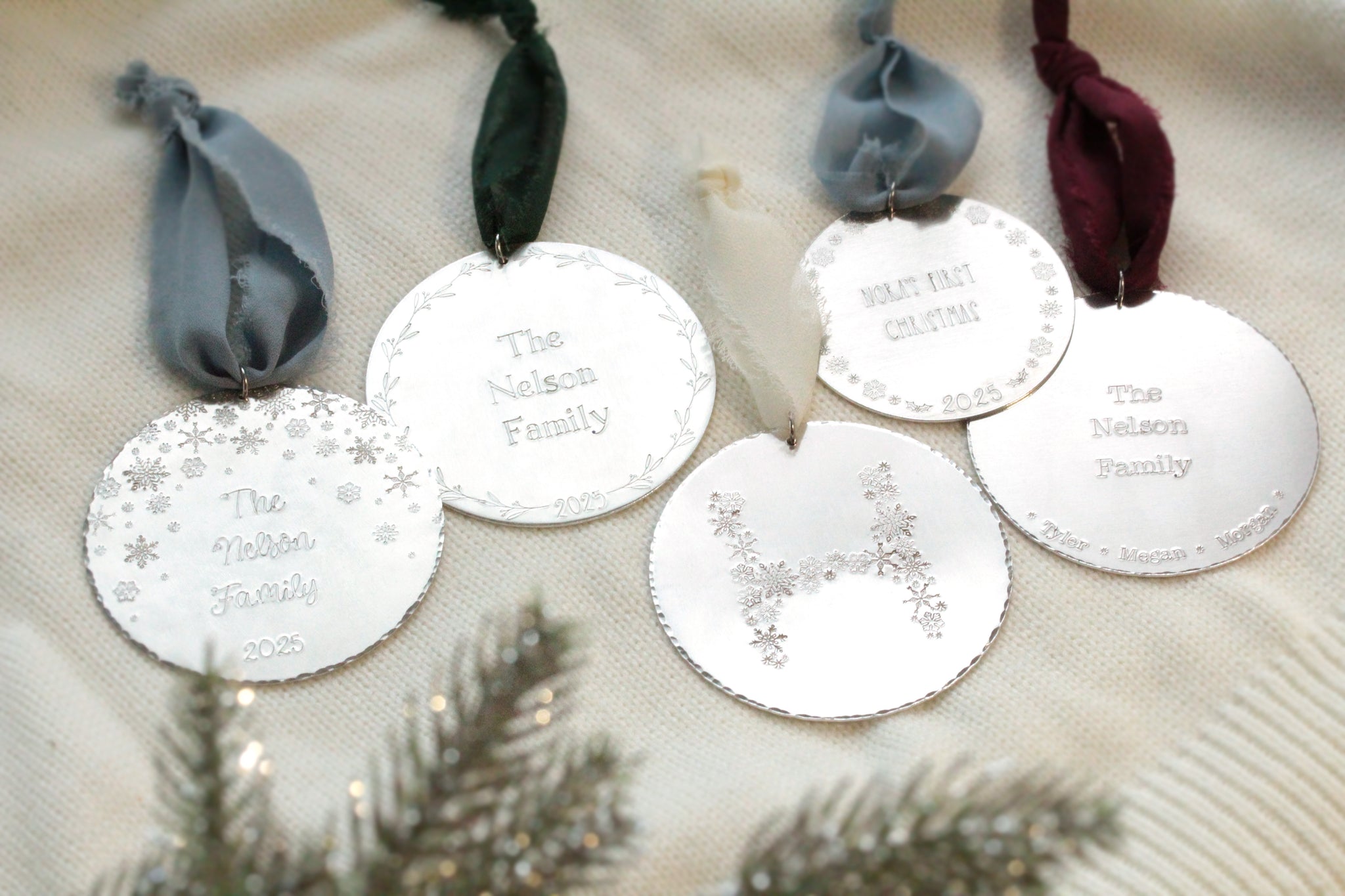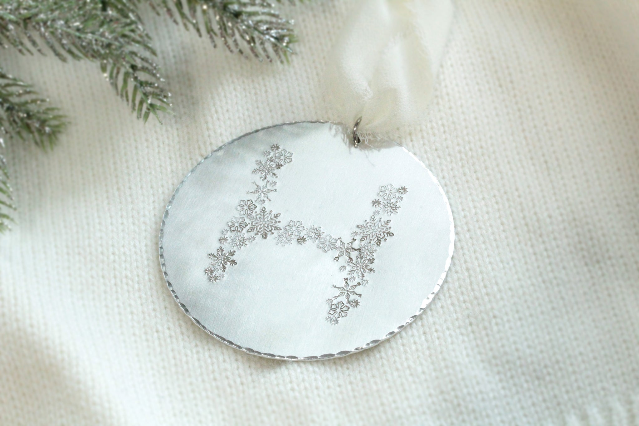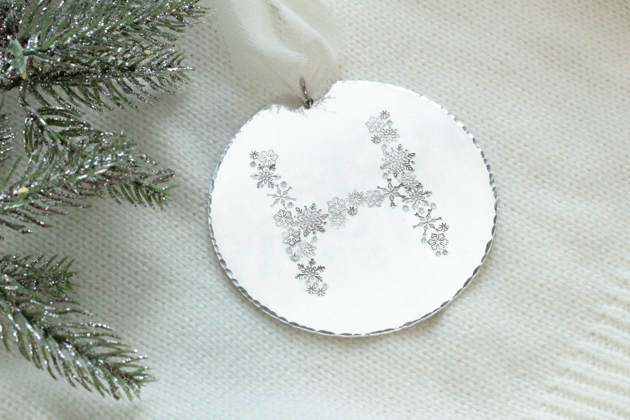 A beautiful silver keepsake Christmas tree ornament monogramed by snowflake impressions