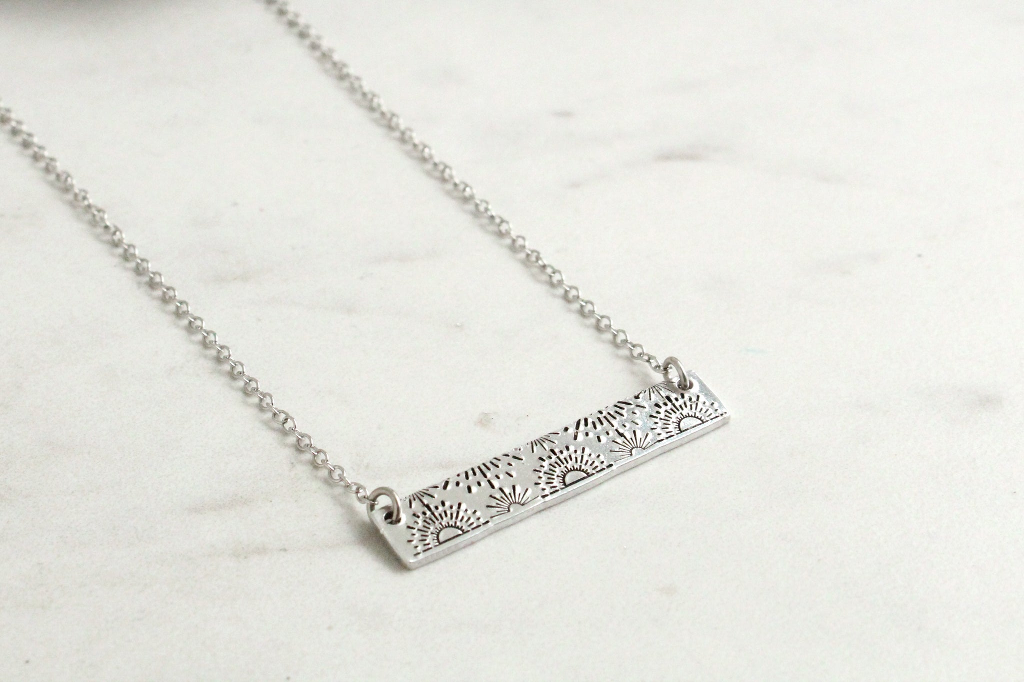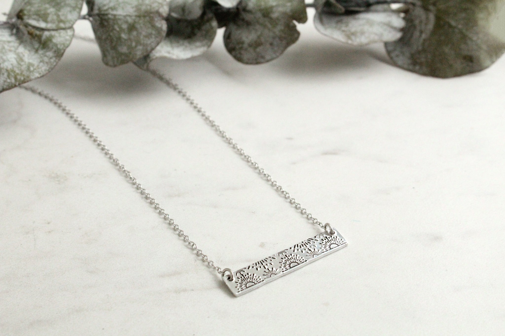 The bar pendant measures 1 1/2" x 1/4" and is made of aluminum which is lightweight, non-tarnish, and hypoallergenic. Chain and clasp are made of stainless steel.