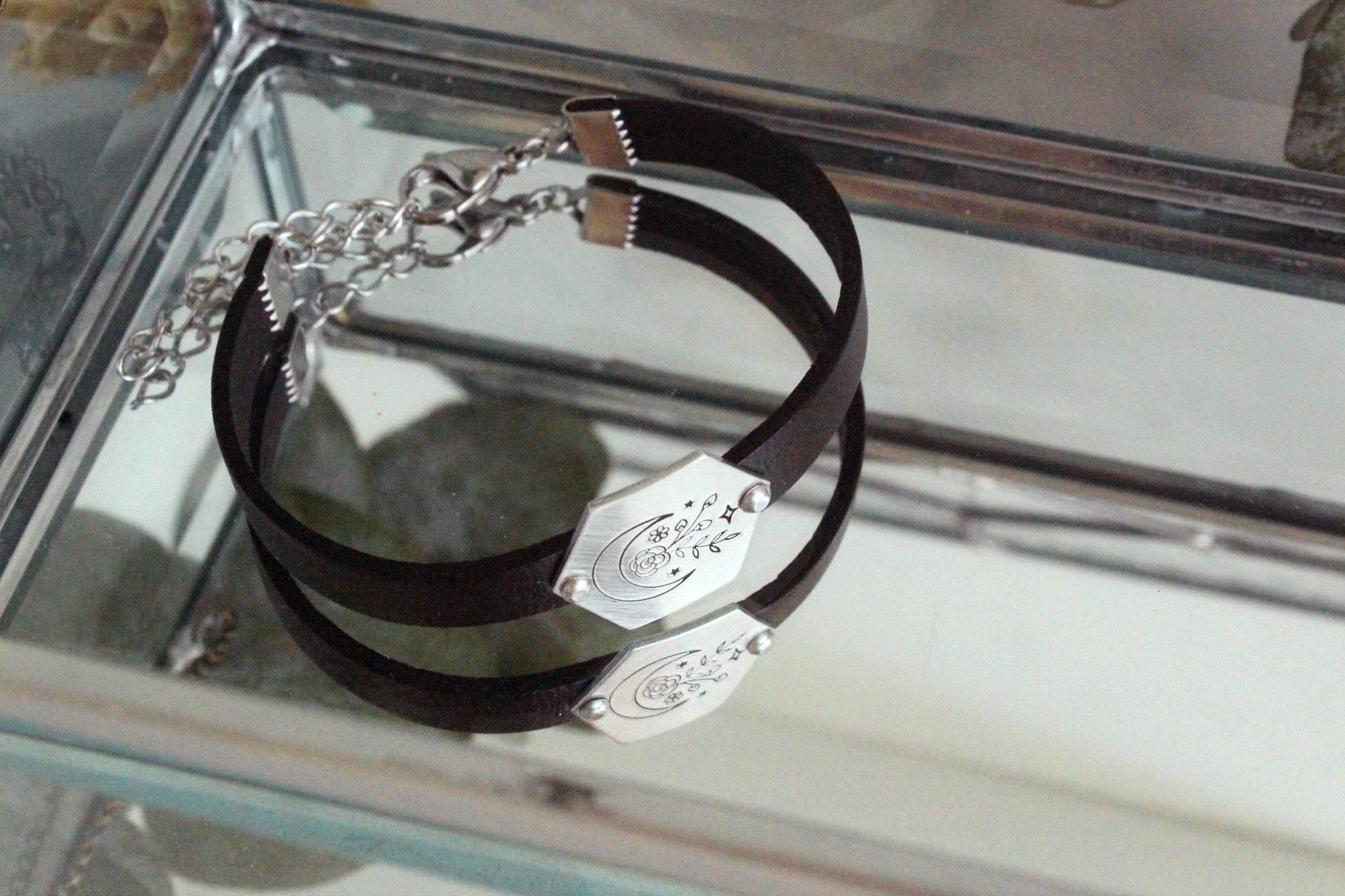 Select bracelet length from the drop down menu. The leather measures 8mm wide and the metal plate measures 3/4". The clasp and findings are made of stainless steel. The bracelet includes a 2" extender chain to ensure you achieve the perfect fit.