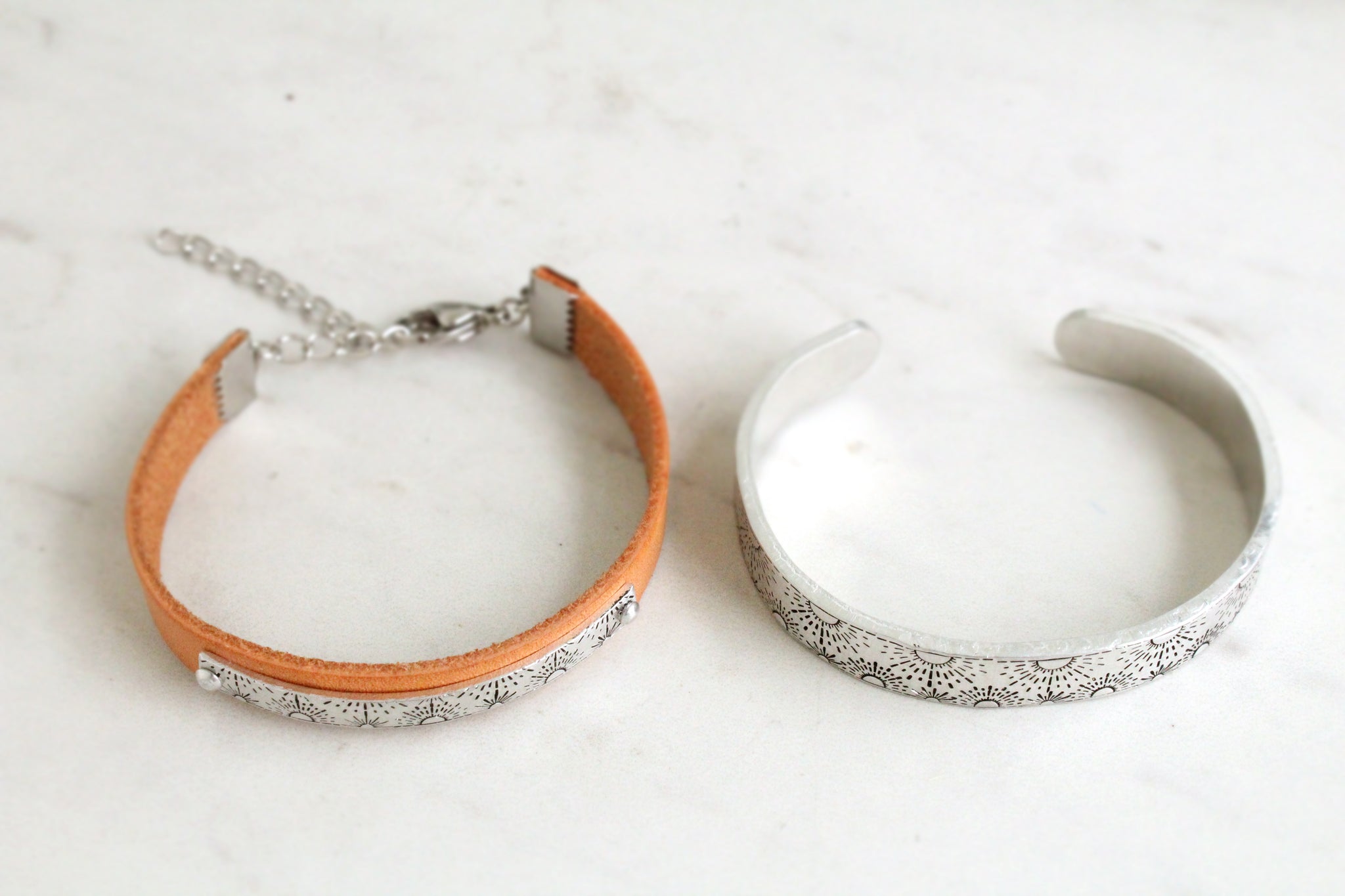 Select bracelet length from the drop down menu. The leather measures 10mm wide and the metal plate measures 2" x 1/4". The clasp and findings are made of stainless steel. The bracelet includes a 2" extender chain to ensure you achieve the perfect fit.
