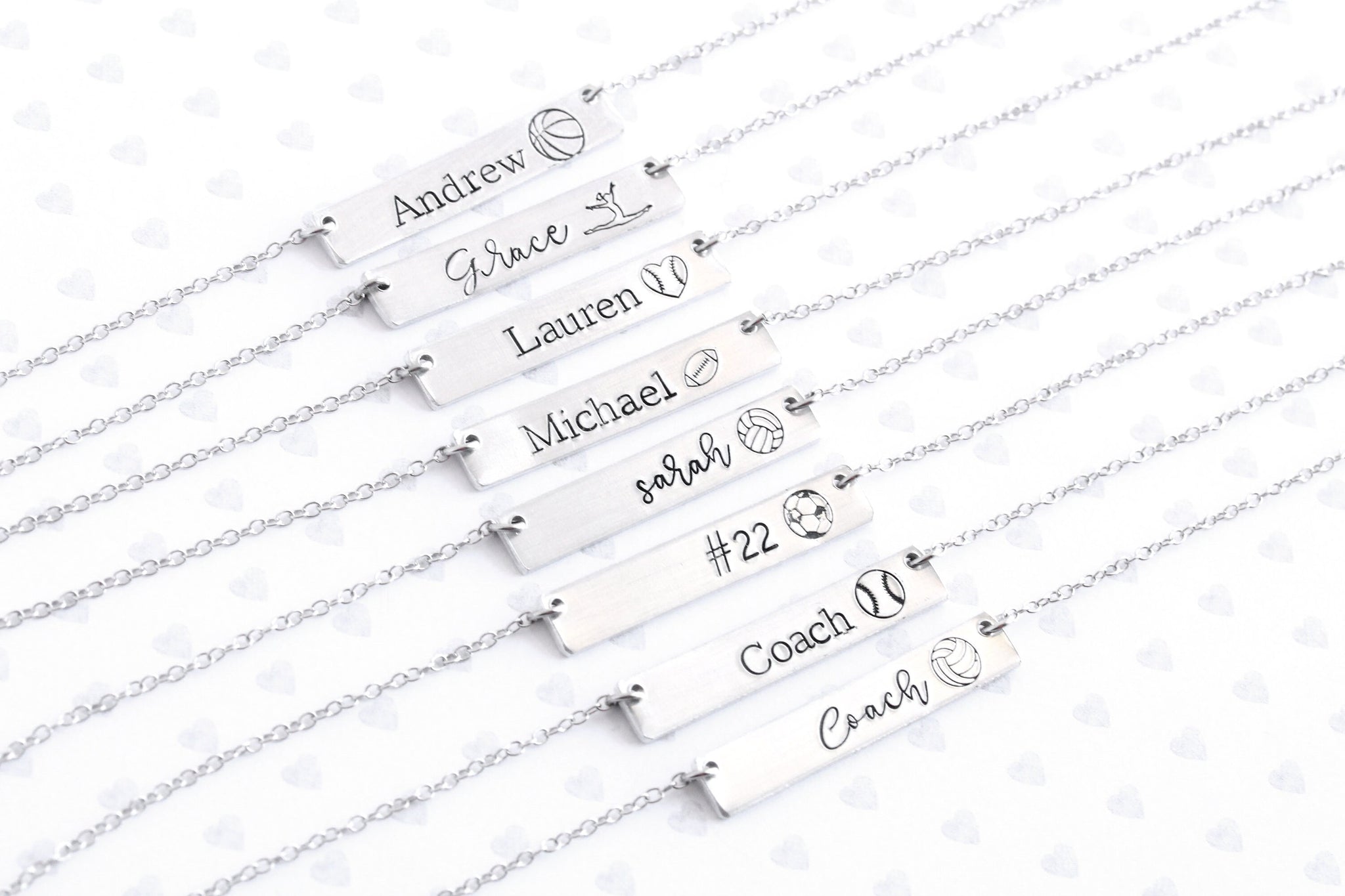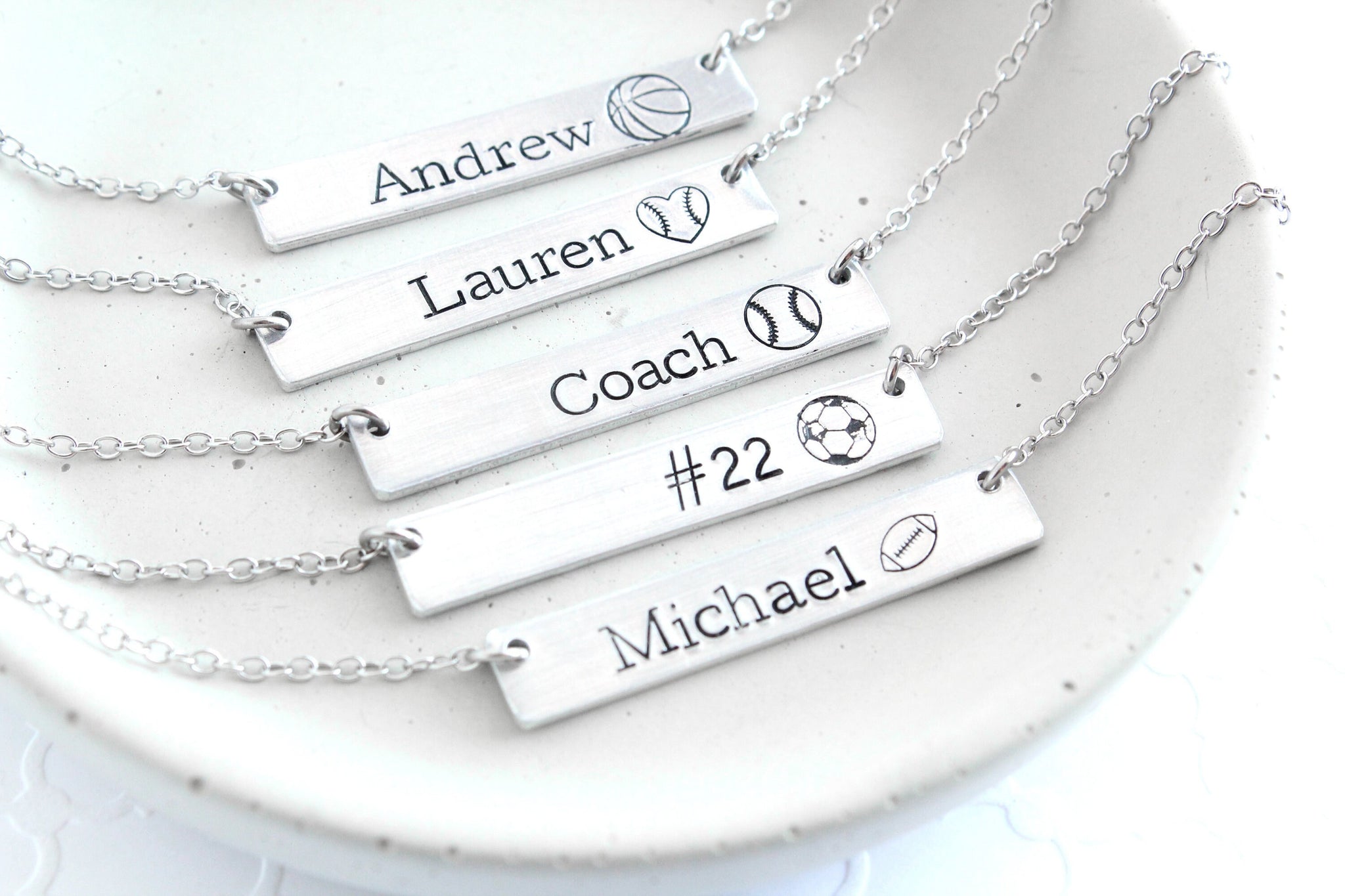 When sports are life, this is what she wants on a necklace. Is your daughter devoting her time to basketball? Are you proud that your son made the team? Honor your favorite athlete with a sports bar necklace. This is also a thoughtful gift for high school and college athletes and even coaches to honor their sport, their team, their effort, and their devotion.
