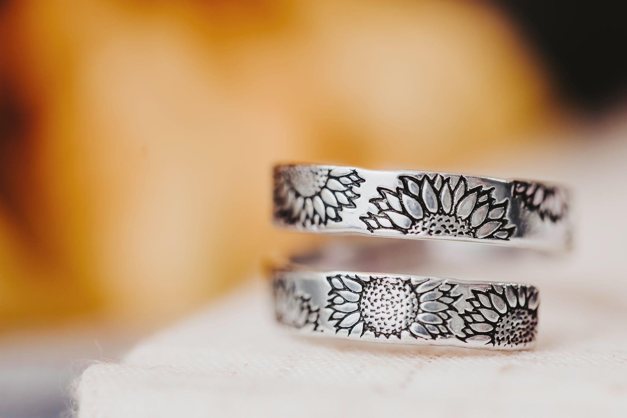 Ring is made of aluminum which is hypoallergenic (no nickel), non-tarnish, and lightweight. Rings are approximately 3" end-to-end and 1/8" wide. They are wrapped to fit specified size, but they are adjustable by several sizes.