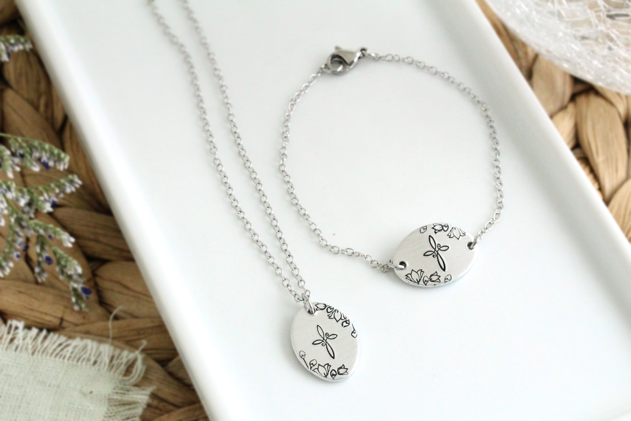 The oval pendant measures 3/4" x 1/2" and is made of aluminum which is lightweight, non-tarnish, and hypoallergenic. Chain and clasp are made of stainless steel.