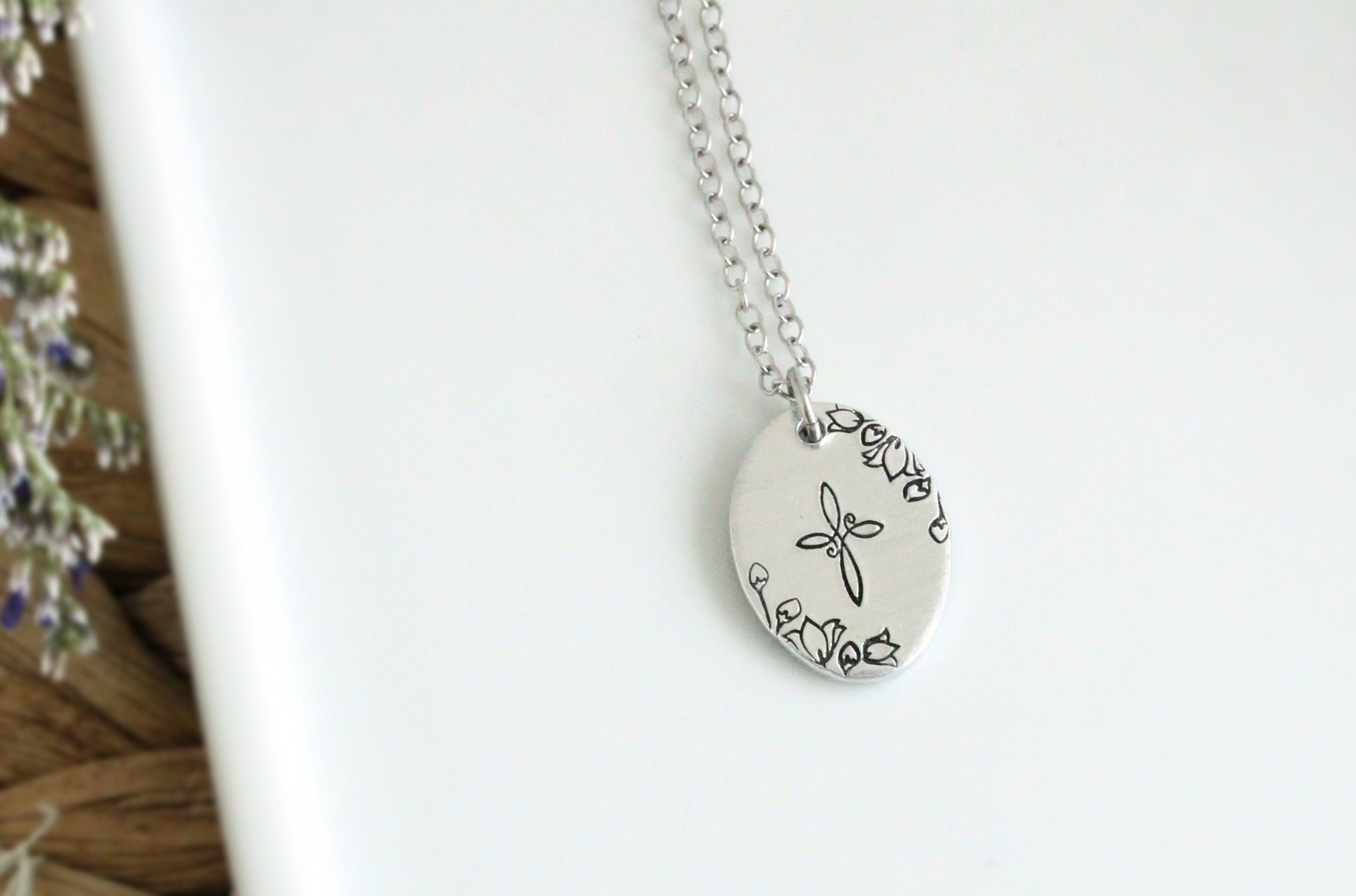 The oval measures 3/4" x 1/2" and is made of aluminum which is lightweight, non-tarnish, and hypoallergenic. Chain and clasp are made of stainless steel.