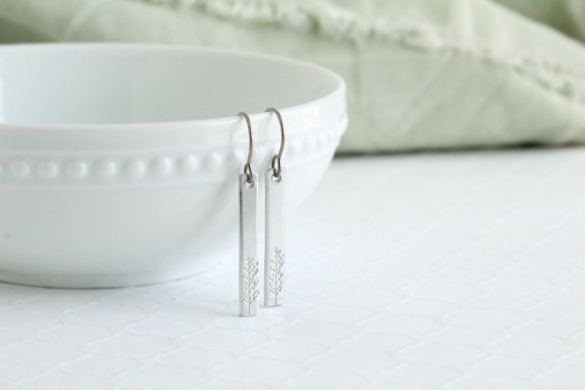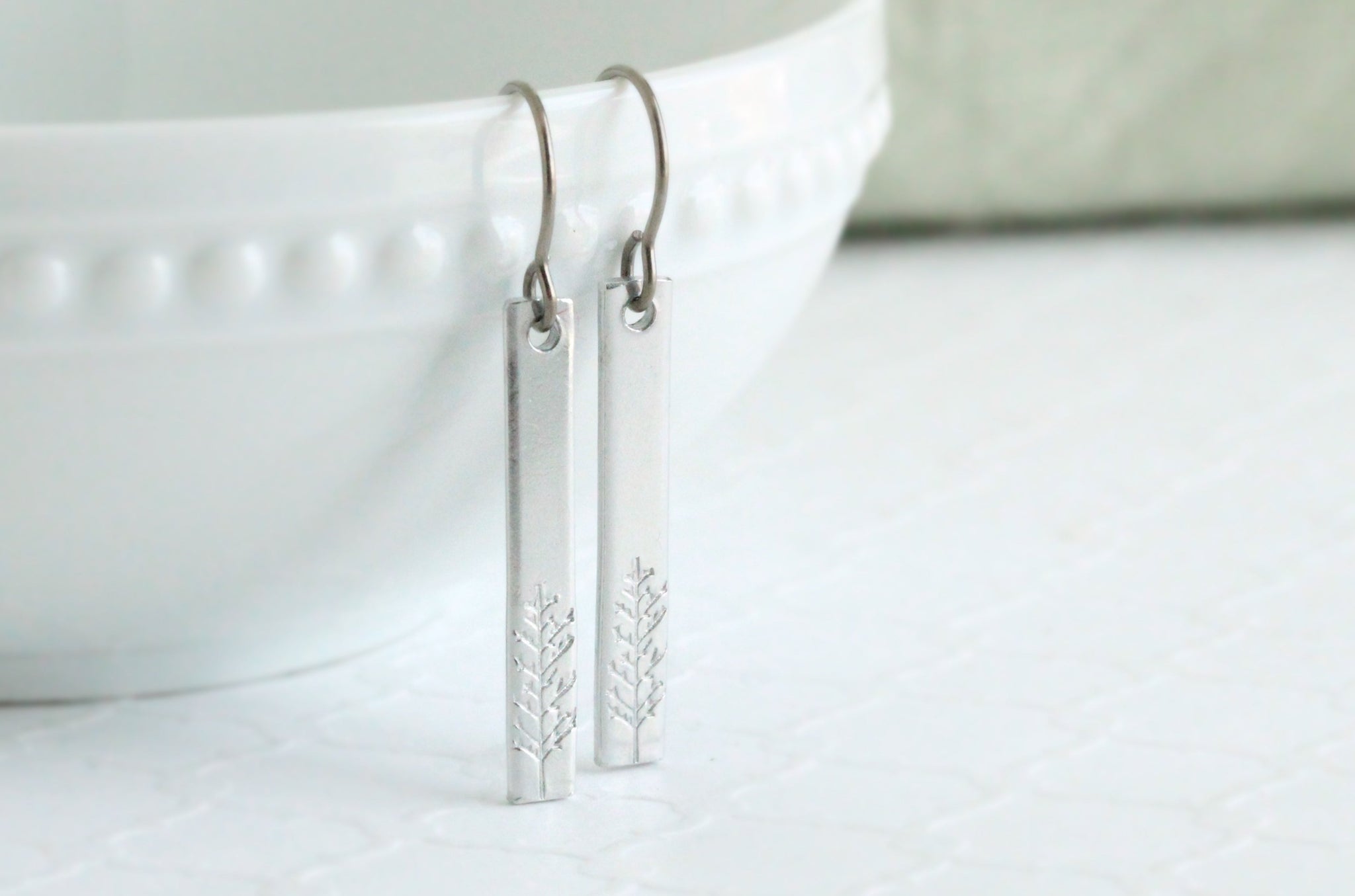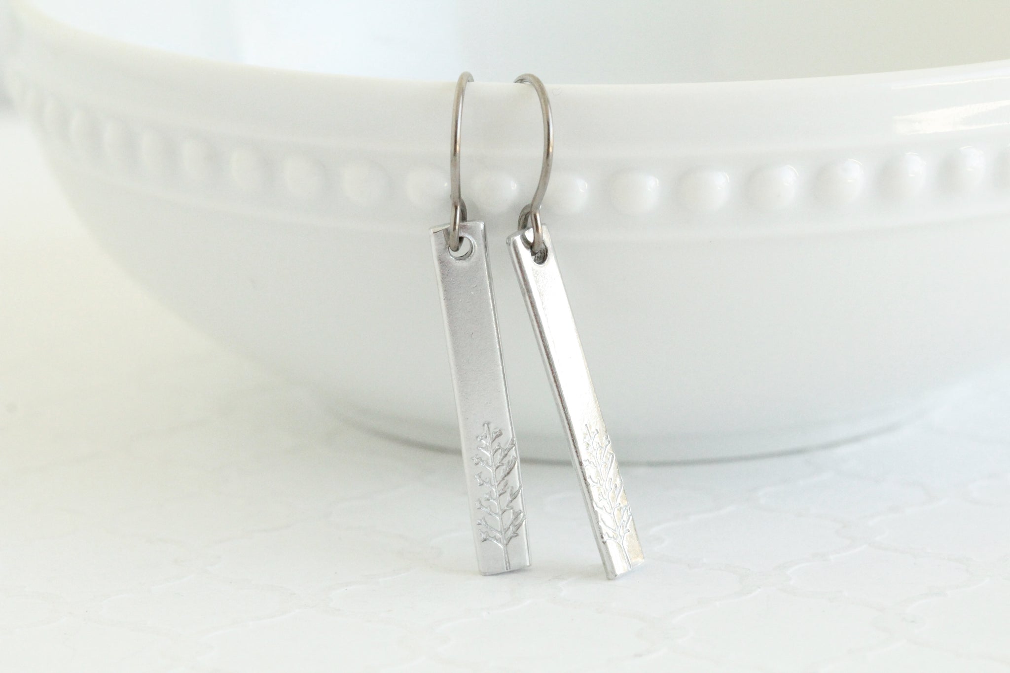 Earring pendants measure 1" x 1/8" and are made of aluminum which is nickel-free, non-tarnish, and very lightweight. The ear wires are made of titanium which is also nickel-free (and more hypoallergenic than even sterling silver).