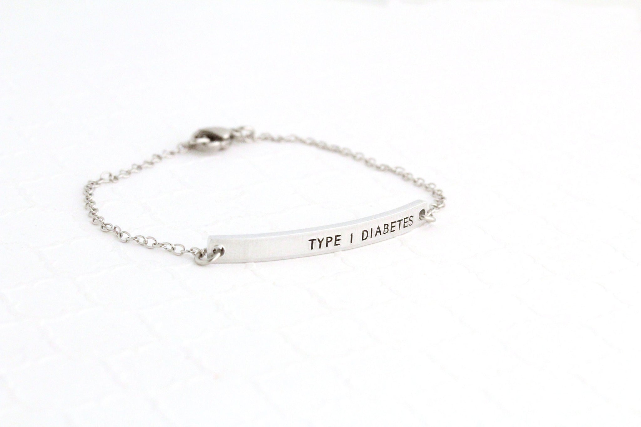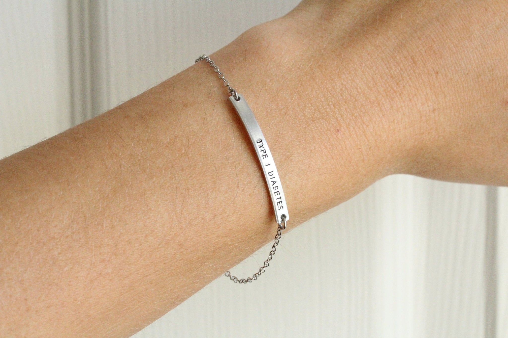 The bar is made of aluminum. The chain and clasp are stainless steel. Length of bar measures 1 1/2 inches long and only 1/8 inch tall. Text is 1.5mm tall, uppercase only, and is aligned to the end of the bracelet. If you prefer it to be centered, please note so in the personalization details.